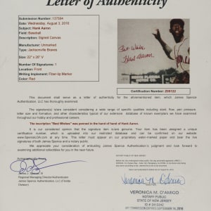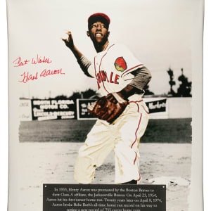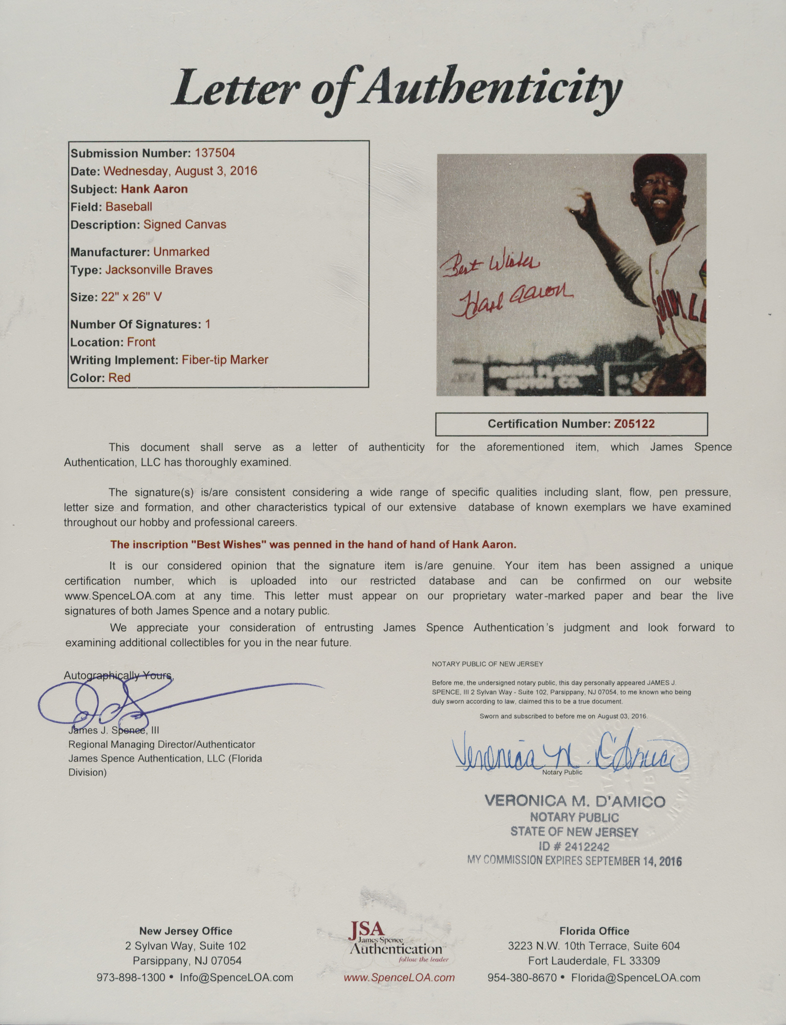 Hank Aaron as a member of the Jacksonville Braves signed canvas. Total dimensions: 22 x 26 inches. Full LOA from James Spence/JSA. The size/weight of this item requires that there will be an additional shipping charge for this lot.