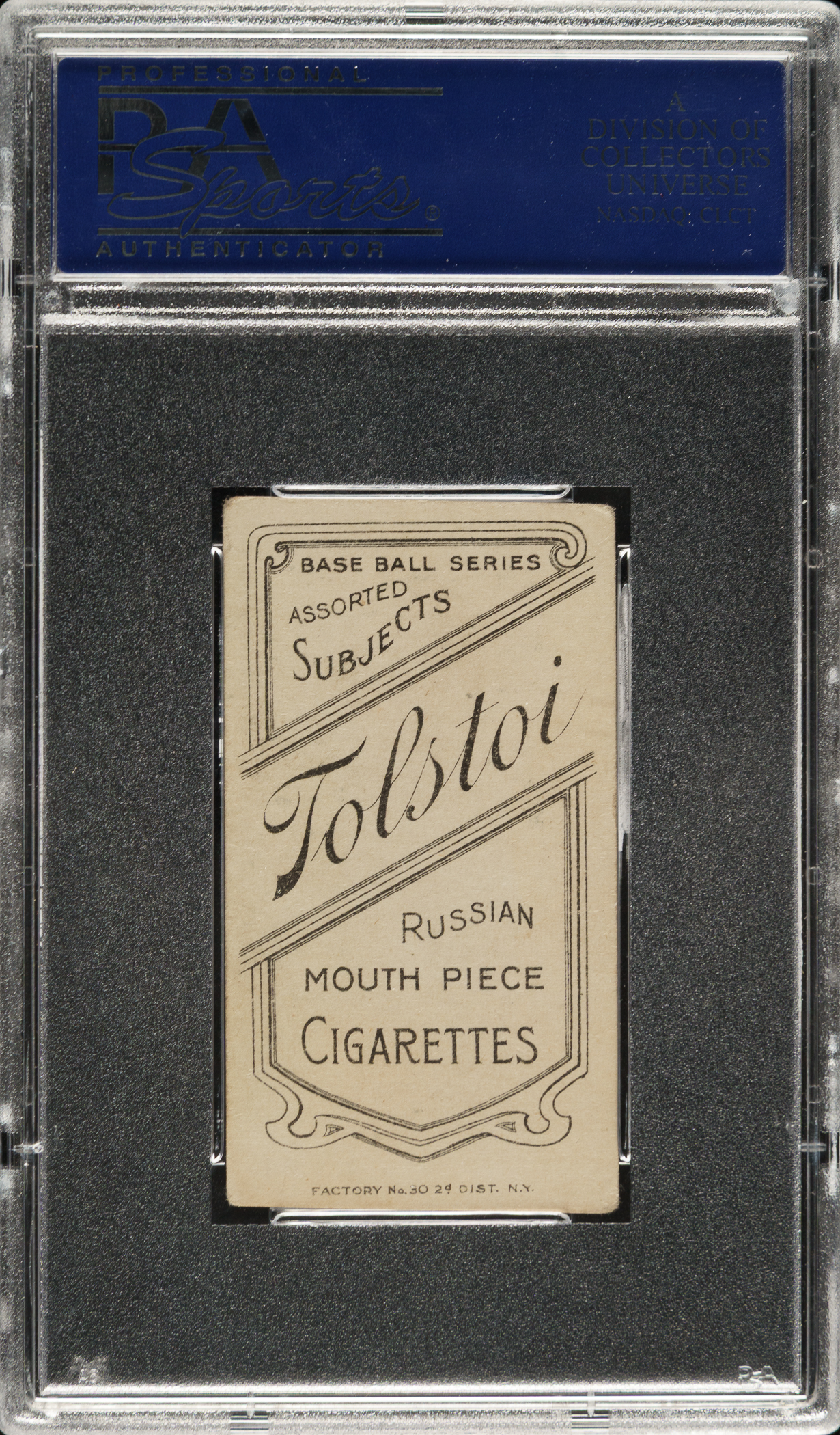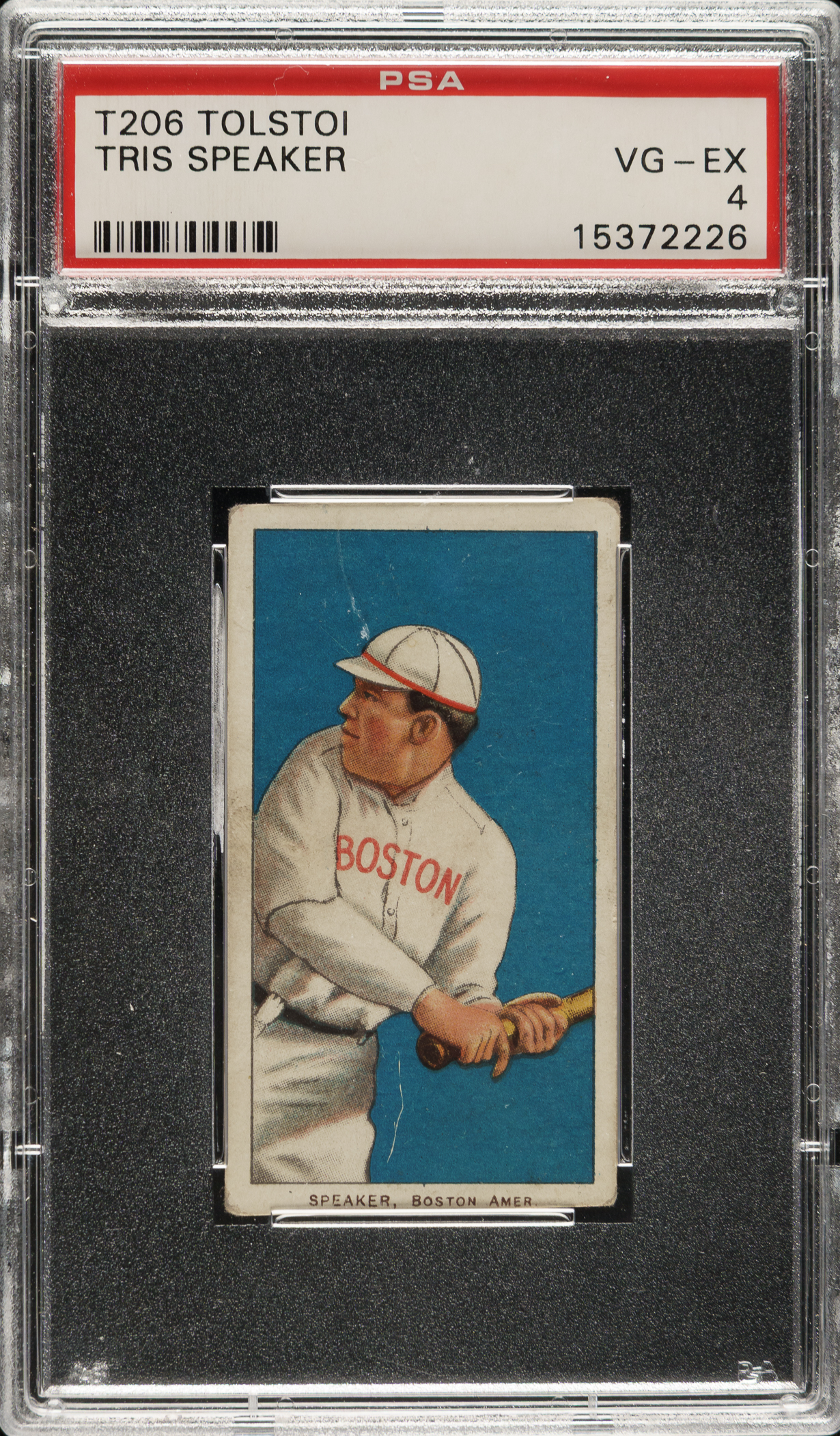 Graded VG-EX 4 by PSA. One of only two examples of this front/back combination graded at this level by PSA with none higher. Very attractive mid-grade example of Boston Red Sox Hall of Famer Tris Speaker from the legendary T206 White Border set with a desirable Tolstoi advertising reverse. This is a particularly important Hall of Fame card in the set, as this is the only T206 pose of Speaker and his rookie card. This well-centered example has a beautiful blue background (there is a surface scratch along the lower portion), excellent registration, and honest corner wear. The important advertising reverse is boldly printed. This is a strong example of Hall of Famer Tris Speaker with a desirable and scarce Tolstoi advertising back.