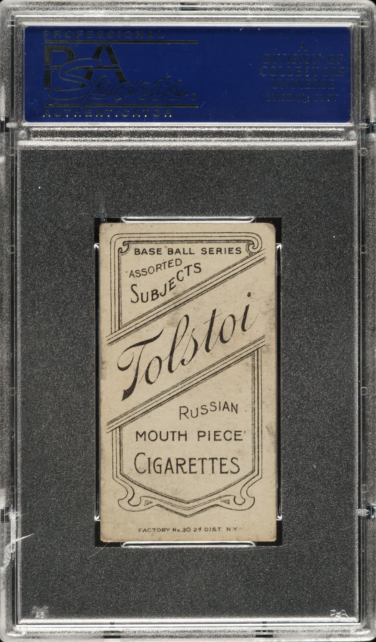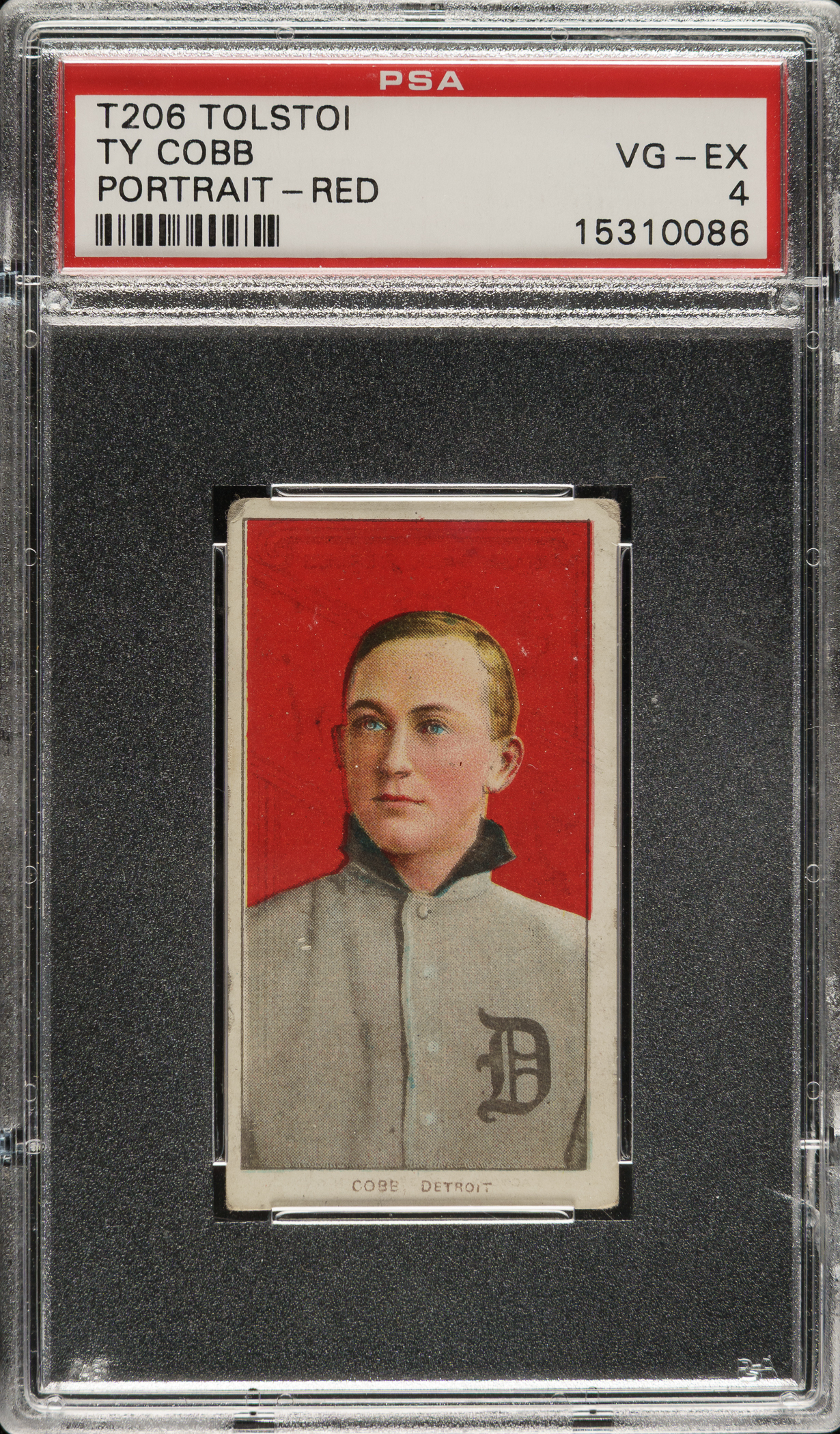 Graded VG-EX 4 by PSA. One of four examples of this front/back combination graded at this level by PSA with just one higher. Superb Ty Cobb (portrait, red background) card from the legendary T206 White Border set with a desirable Tolstoi advertising reverse. Cobb's red-background portrait pose has long been considered one of the classics of the T206 set and of all vintage cards. The fact that this example has an uncommon Tolstoi advertising reverse makes it of particularly special note. T206Resource.com ranks Tolstoi as the 18th most difficult back (out of 39) available within the T206 White Border set. The offered example has a beautiful red background, outstanding registration, and honest corner wear (weaker top left). The important advertising reverse is boldly printed and is lightly soiled.