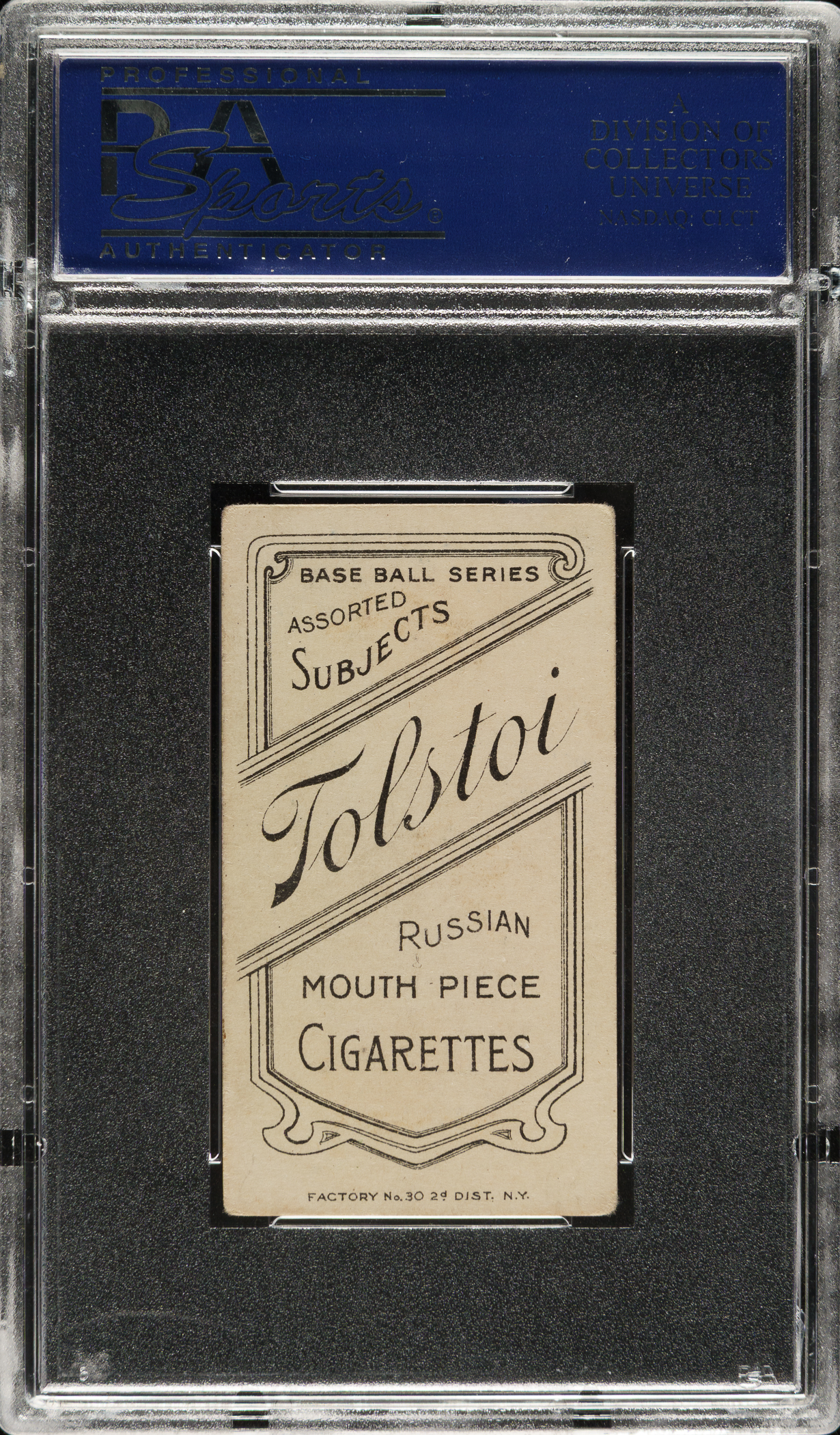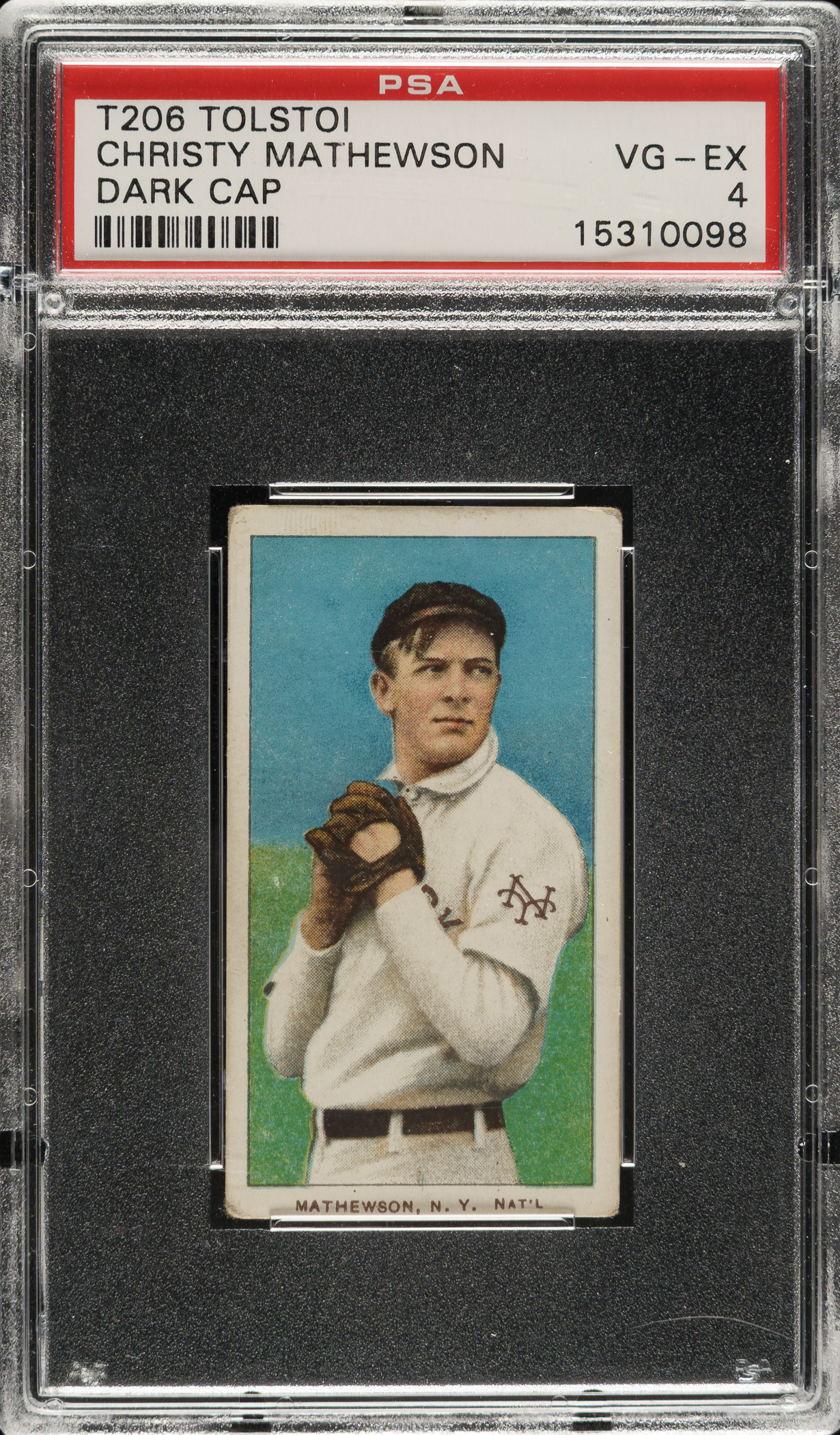 Graded VG-EX 4 by PSA. Only three examples of this front/back combination have been graded higher by PSA to date. Superb example of Hall of Famer Christy Mathewson (dark cap) from the classic T206 series with a desirable Tolstoi advertising reverse. The T206 Christy Mathewson dark cap pose is one of the most recognizable cards in all of card collecting. The offered example has beautiful colors, outstanding registration, excellent centering, and honest corner wear. The Tolstoi advertising reverse is boldly printed.
