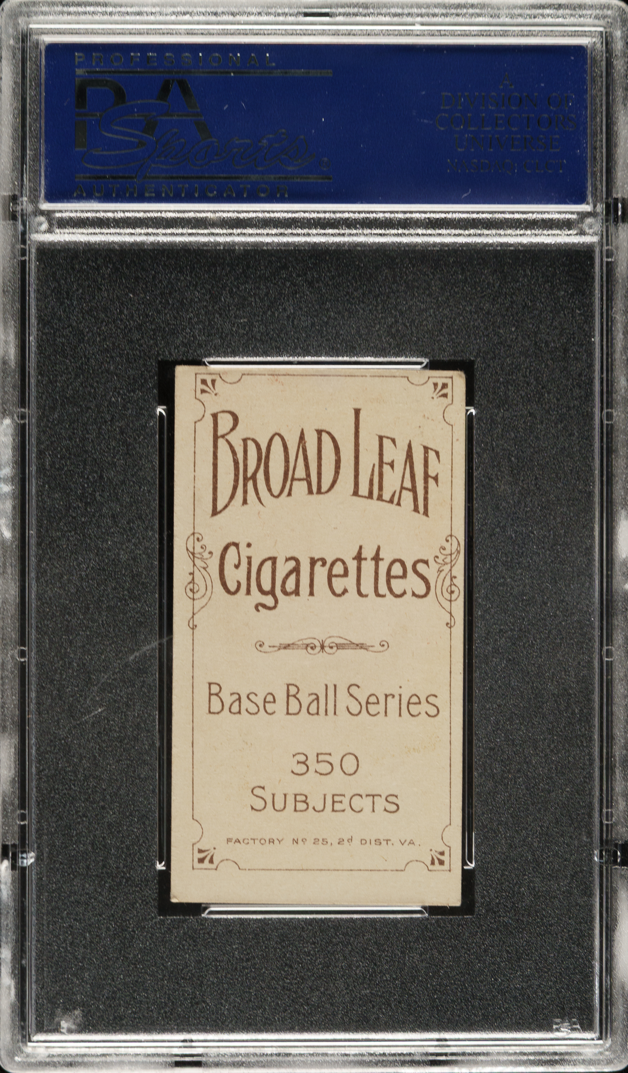 Graded VG-EX 4 by PSA. This is the ONLY confirmed example of this front/back combination graded by PSA and SGC! Beautiful example of Pryor McElveen (Brooklyn Superbas) from the T206 White Border set with a desirable and rare Broad Leaf 350 advertising reverse. Broad Leaf 350 series backs are unusual and very rare. According to T206Resource.com, the Broad Leaf 350 series back ranks as the ninth scarcest on its list of 39 different T206 advertising backs. The offered example has vibrant colors, a crisp image, and even corner wear. The important Broad Leaf advertisement is boldly printed. There is a light crease just below the top border noted for accuracy.