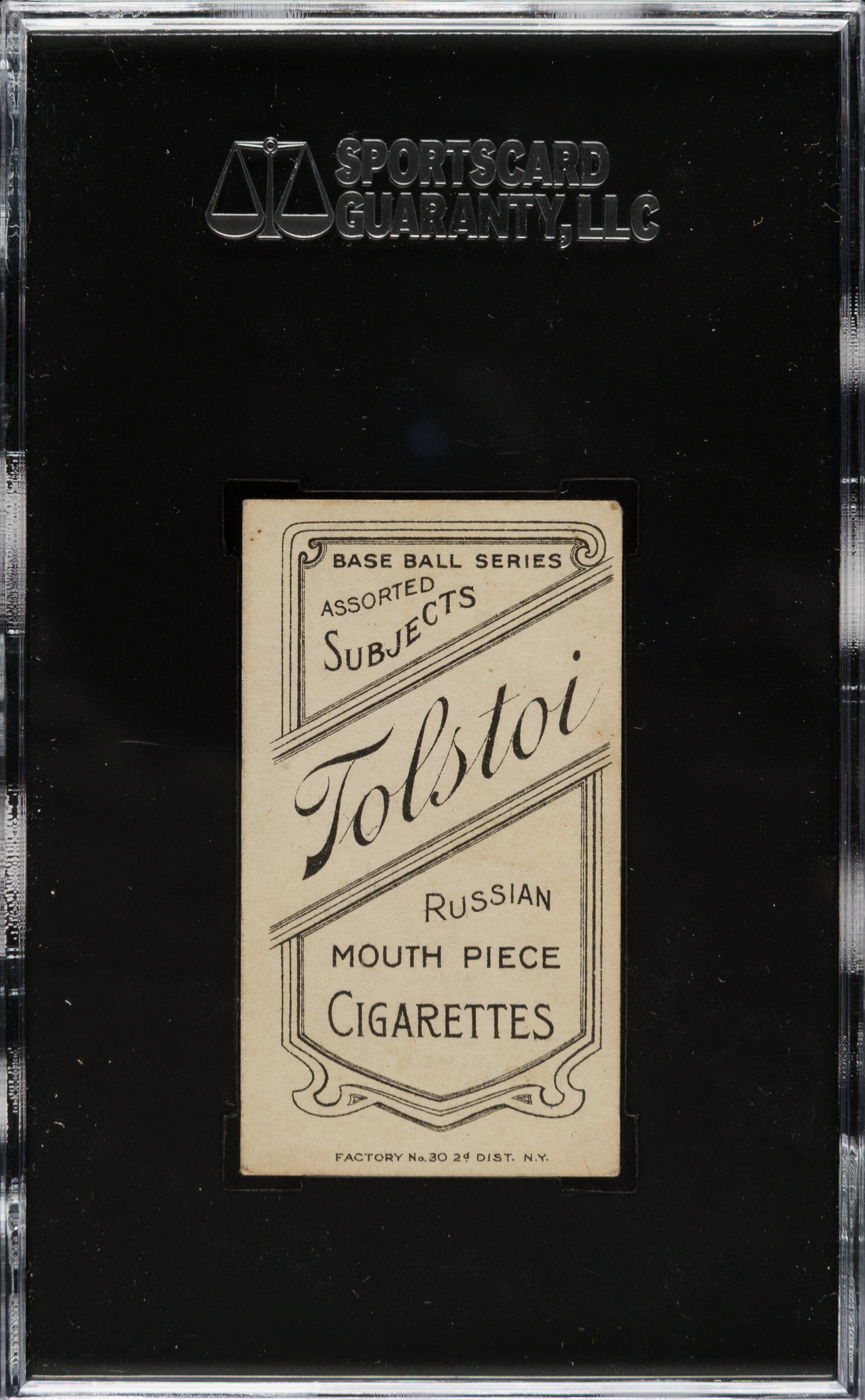 Graded VG/EX 50 by SGC. Only one example of this front/back combination has been graded higher by SGC to date. Outstanding example of Hall of Famer Christy Mathewson (dark cap) from the classic T206 series with a desirable Tolstoi advertising reverse. The T206 Christy Mathewson dark-cap pose is one of the most recognizable cards in all of card collecting. The offered example has beautiful colors, a crisp image, and light corner wear. The Tolstoi advertising reverse is boldly printed.
