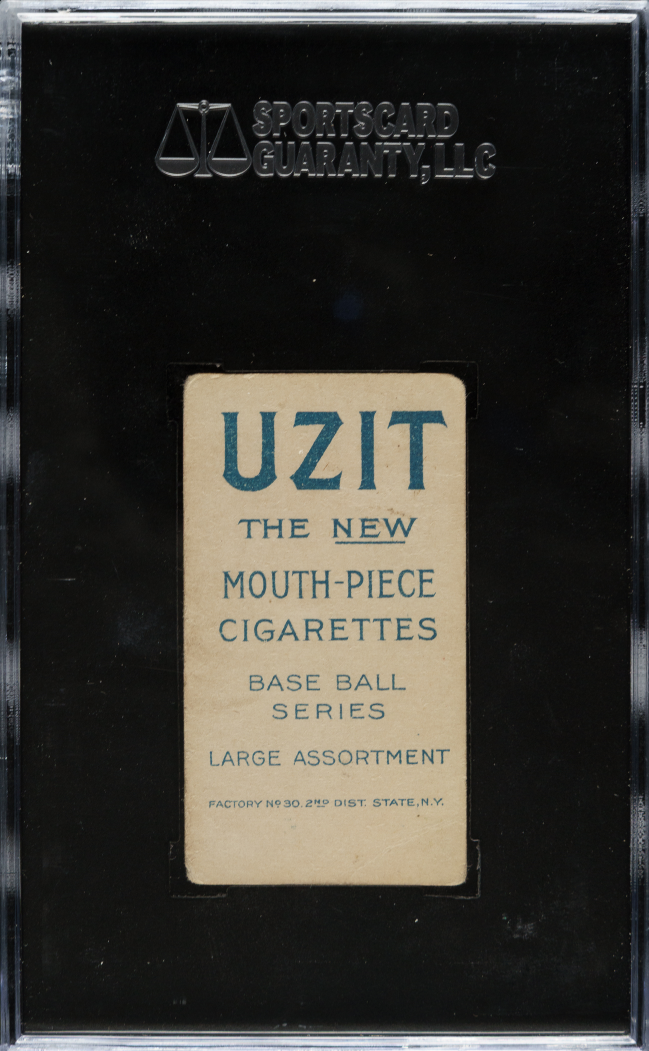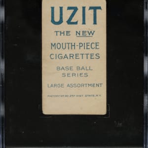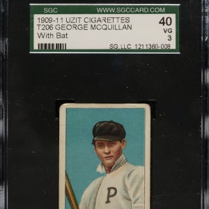 Graded VG 40 by SGC. One of only two examples of this front/back combination graded at this level by SGC with just one higher. Outstanding example of George McQuillan (with bat, Philadelphia Phillies) from the classic T206 set with an extremely desirable Uzit advertising reverse. According to T206Resource.com, Uzit ranks as the sixth most difficult (out of 39) advertising backs to find. This well-centered example features brilliant colors, a crisp image, and moderate corner wear. The important Uzit advertising reverse is boldly printed and clean. A few creases contribute to the assigned grade.