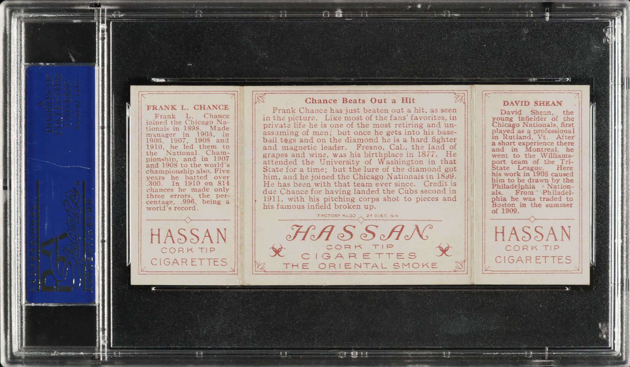Lot # 504: 1912 T202 Hassan Triple Folder "Chance Beats Out a Hit" Frank Chance/Shean PSA NM 7