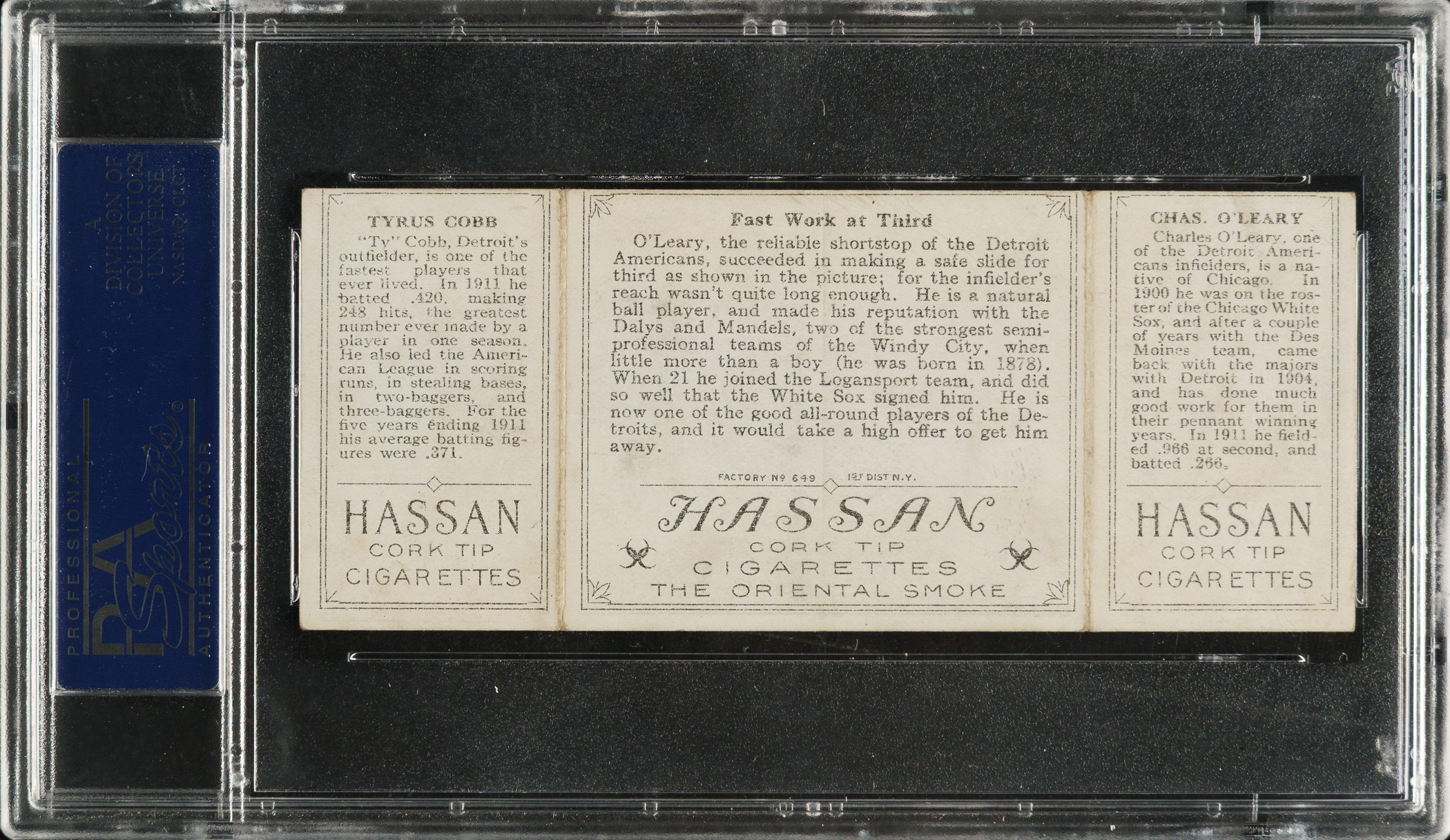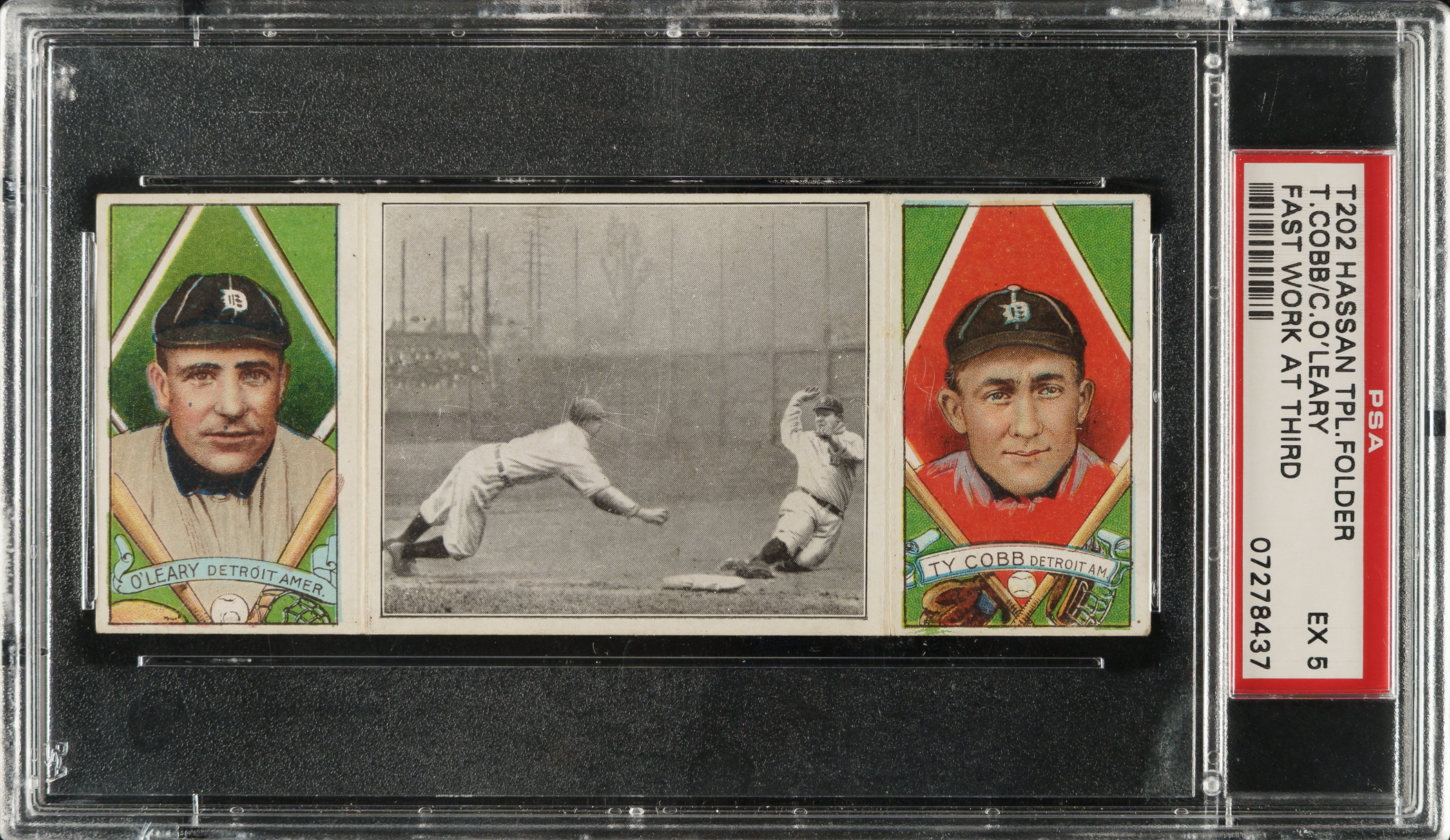 Graded EX 5 by PSA. Attractive example of one of five cards featuring Detroit Tigers Hall of Famer Ty Cobb in the popular T202 Triple Folders series. T202 Triple Folders are one of the most condition-sensitive prewar issues. The offered example features vibrant colors, outstanding registration, and even corner wear. Boldly printed reverse with light soiling. This is a strong example that would qualify as a highlight for any serious Ty Cobb or prewar card collection.
