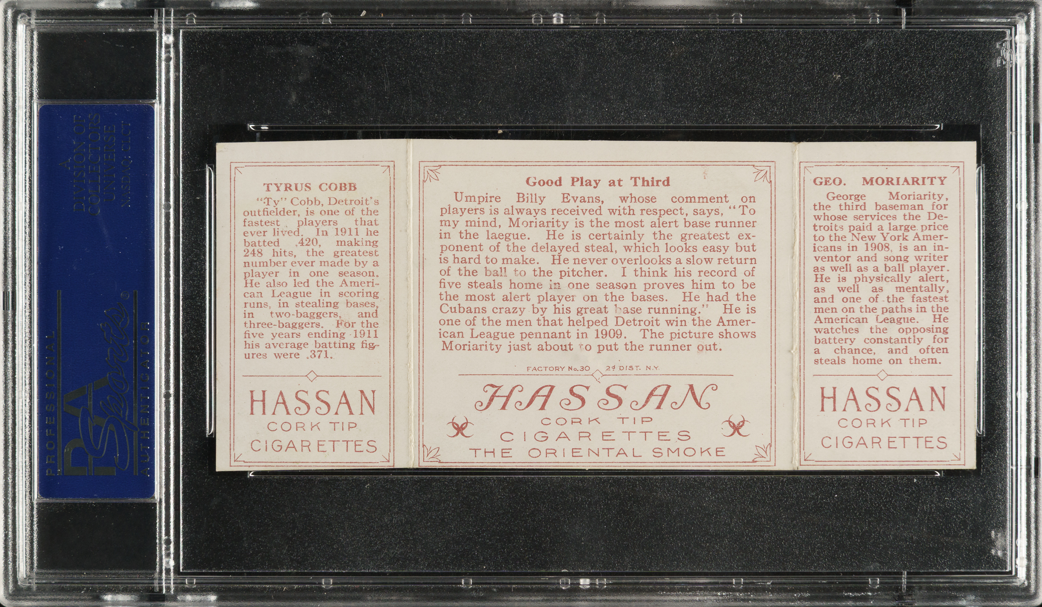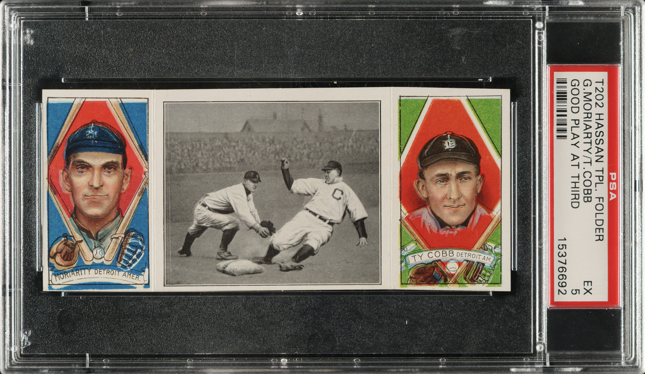 Graded EX 5 by PSA. Beautiful example of one of five cards featuring Cobb in the popular T202 Triple Folders series. This card displays vibrant colors, slightly out-of-focus registration, and light corner wear. This example features a slightly uneven cut along the top and bottom edges (as made and noted for accuracy). Boldly printed reverse. This is a solid mid-grade example from arguably the most interesting and beautiful baseball tobacco issue ever produced of one of the key cards in the T202 Triple Folders set. A worthy addition to any T202 Triple Folder, Ty Cobb, or prewar-card collection.