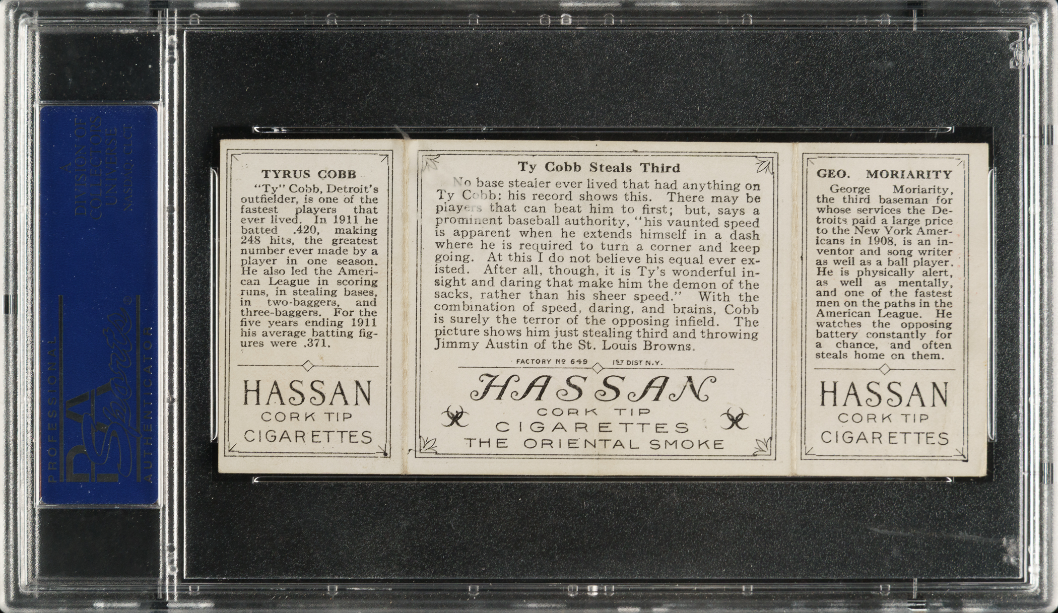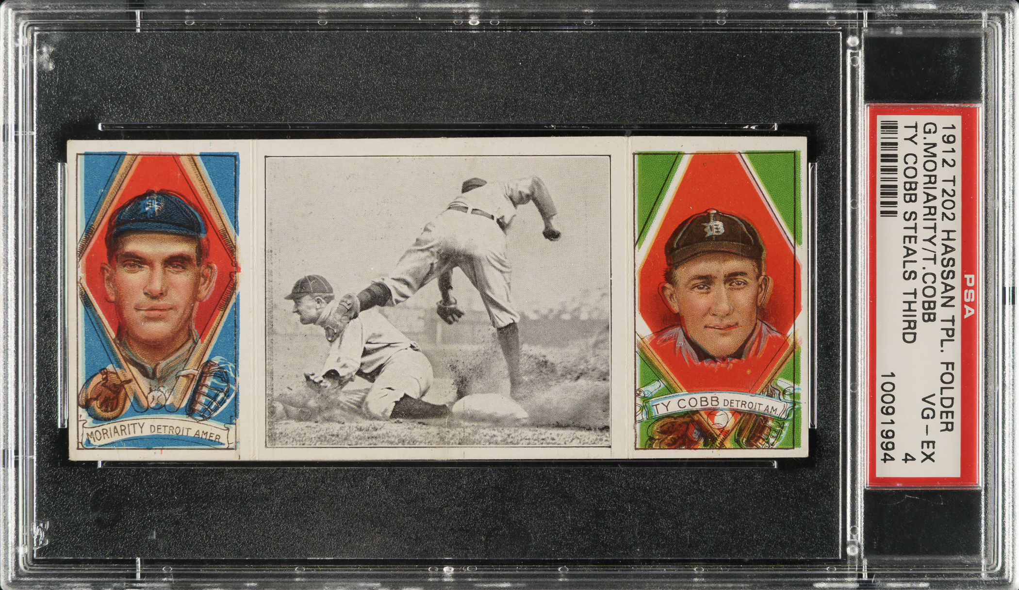 Graded VG-EX 4 by PSA. This is one of the most desirable of the five Ty Cobb cards in the 1912 T202 Hassan Triple Folders series, featuring him on both an end panel and center panel. The center panel has Cobb in his famous sliding pose, which is based on a photograph by legendary photographer Charles Conlon. T202 Triple Folders are one of the most condition-sensitive of all card issues, as well as one of card collecting's most popular and classic sets. Because of their unique design, with folding end-panels, they are particularly difficult to find in high grade and are often graded very harshly. The offered example has vibrant colors, slightly out-of-focus registration, and light corner wear. This example features a slightly uneven cut along the top edge (as made and noted for accuracy). Light creases near the lower left corner contribute to the assigned grade. This is a fantastic mid-grade example from arguably the most interesting and beautiful baseball tobacco issue ever produced. A worthy addition to a T202, Ty Cobb, or prewar-card collection.