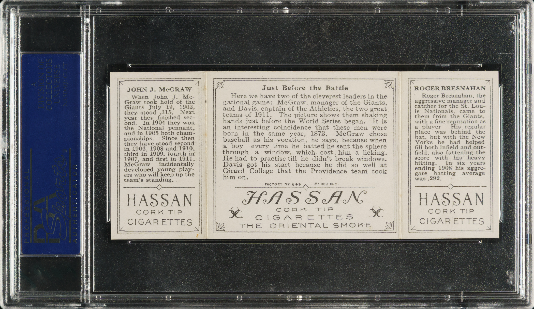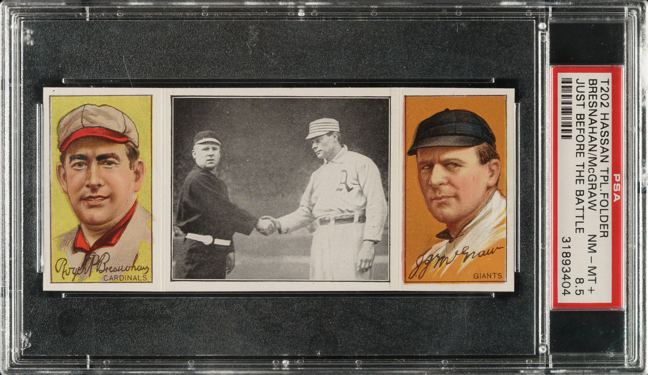 Graded NM-MT+ 8.5 by PSA. This is the only example graded at this level by PSA with none higher! Beautiful high-grade example of “Just Before The Battle" from the T202 Hassan Triple Folder set featuring Hall of Famers John McGraw of the New York Giants and Roger Bresnahan of the St. Louis Cardinals. This card displays vibrant colors, strong corners, and outstanding registration. There is a subtle irregular factory cut along the top and bottom edges (as made and noted for accuracy). This is an extremely attractive example from one of vintage-card collecting's most classic and condition-sensitive sets.