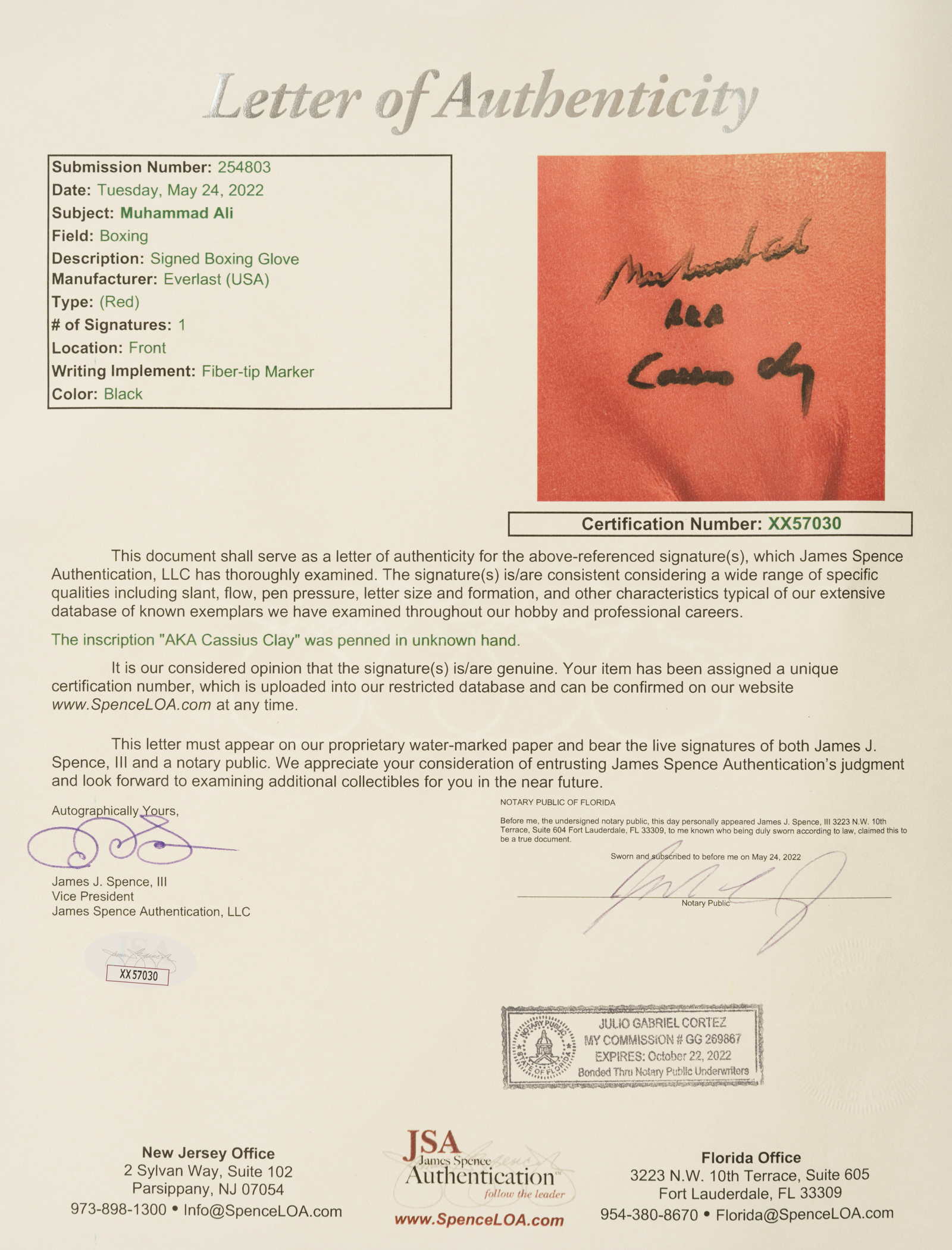 Boxing Hall of Famer Muhammad Ali signed Everlast boxing glove. Full LOA from James Spence/JSA. The size/weight of this item requires that there will be an additional shipping charge for this lot.