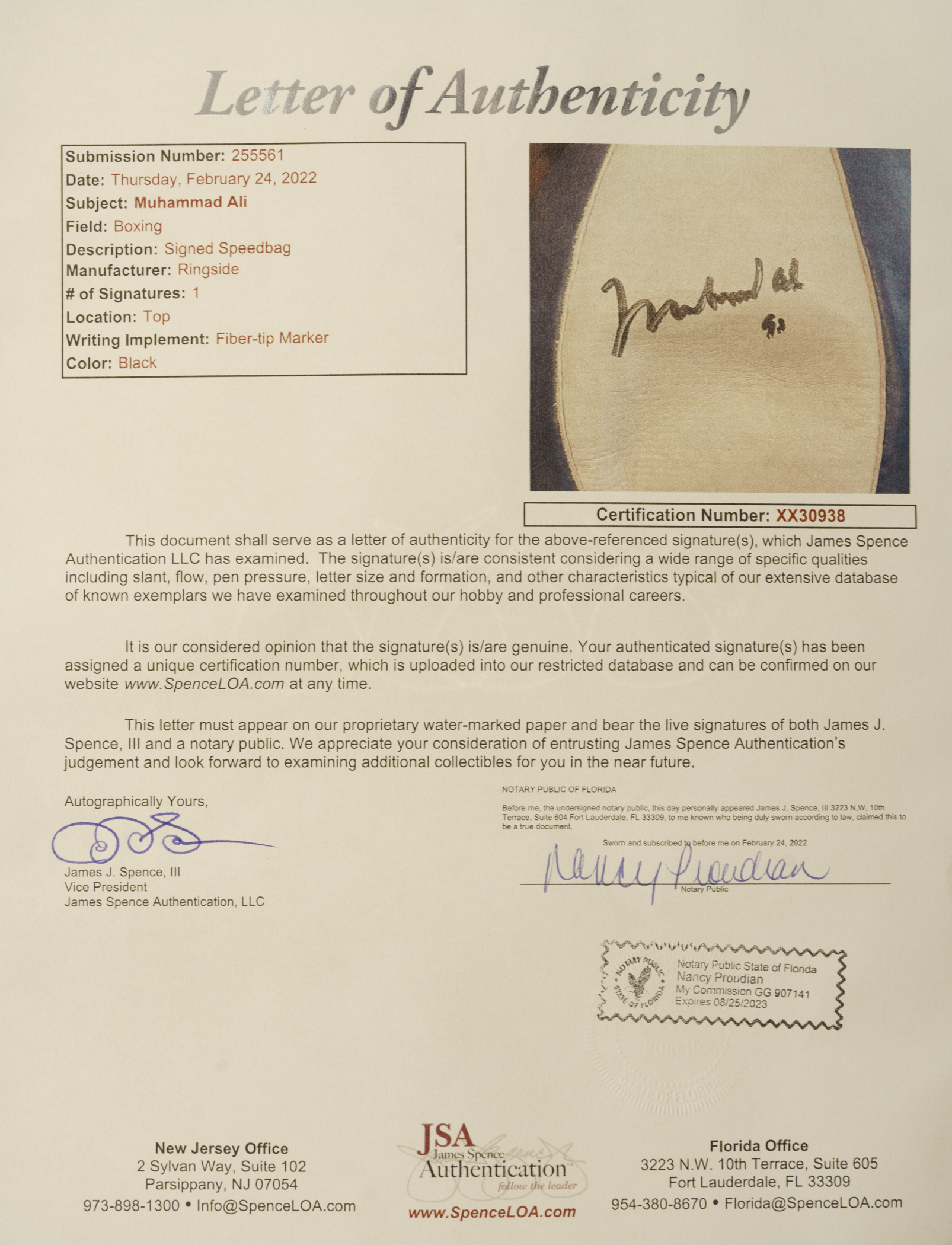 Boxing Hall of Famer Muhammad Ali signed Ringside speedbag. Full LOA from James Spence/JSA.