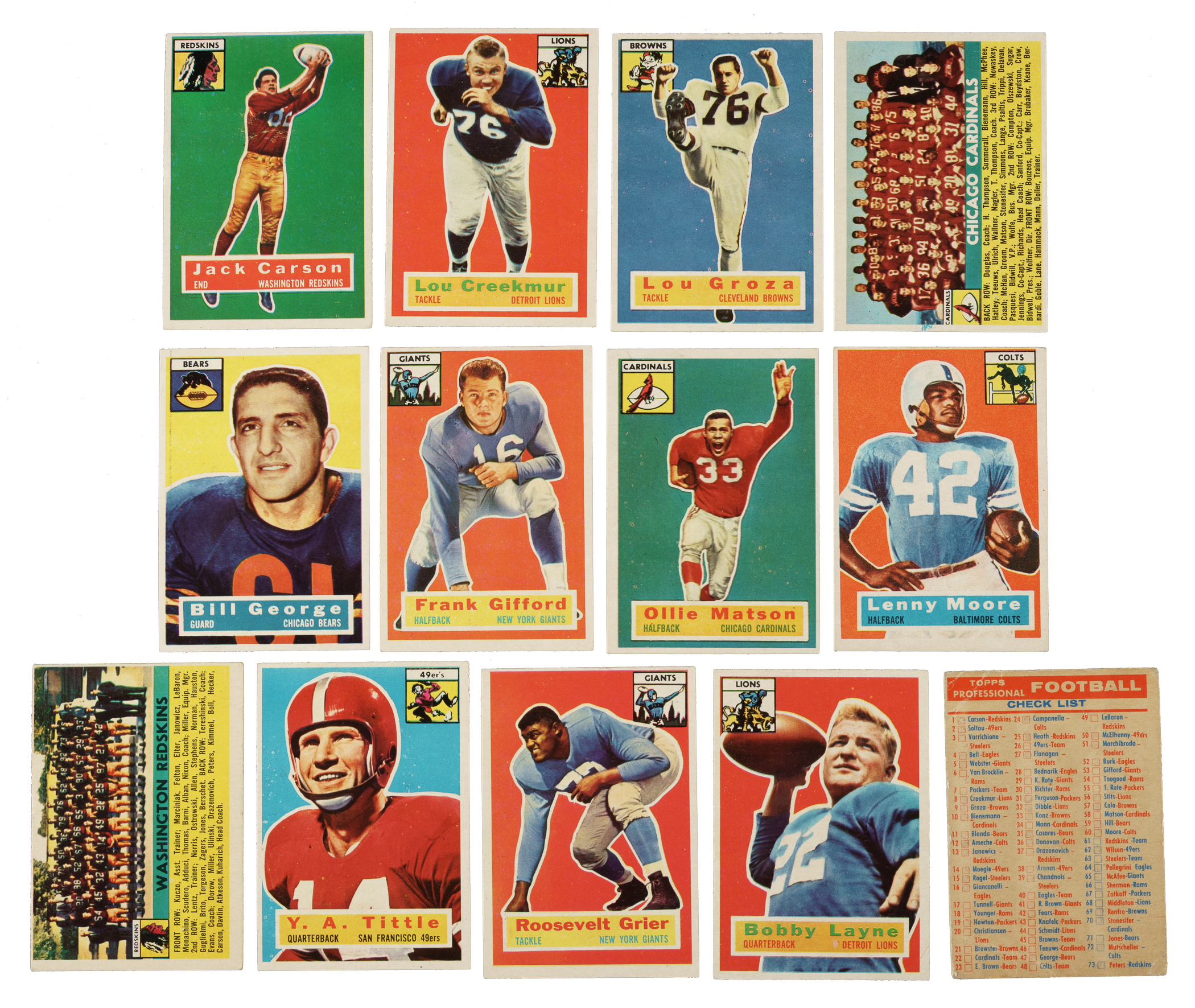 Presented is a complete 120-card set of 1956 Topps football cards, highlighted by numerous Hall of Famers and stars of the era. This set includes an example of the unnumbered checklist card. The condition is 14% Ex-Mt or slightly better, 75% Vg-Ex to Ex, and 11% Gd to Vg (including one lesser and two miscut). Keys: #1 Carson SP (Vg-Ex+), 6 Van Brocklin (Nr/Mt+), 11 Blanda (Ex), 22 Cardinals Team SP (Ex-Mt), 41 R. Brown RC (miscut left edge, otherwise Vg-Ex+), 44 Schmidt RC (Ex-Mt), 47 George RC (Ex-Mt), 53 Gifford (Ex), 58 Matson SP (Vg-Ex+), 60 Moore RC (10/90 T/B, otherwise Ex), 61 Redskins Team SP (10/90 T/B, otherwise Vg), 86 Tittle (Nr/Mt), 101 Grier RC (Ex), 116 Layne (Vg-Ex), and Checklist (partially erased pencil marks, otherwise Vg-Ex). This is a crisp, clean, and very attractive complete 1950s Topps football set with many highlights. Total: 121 cards (set of 120 plus checklist).