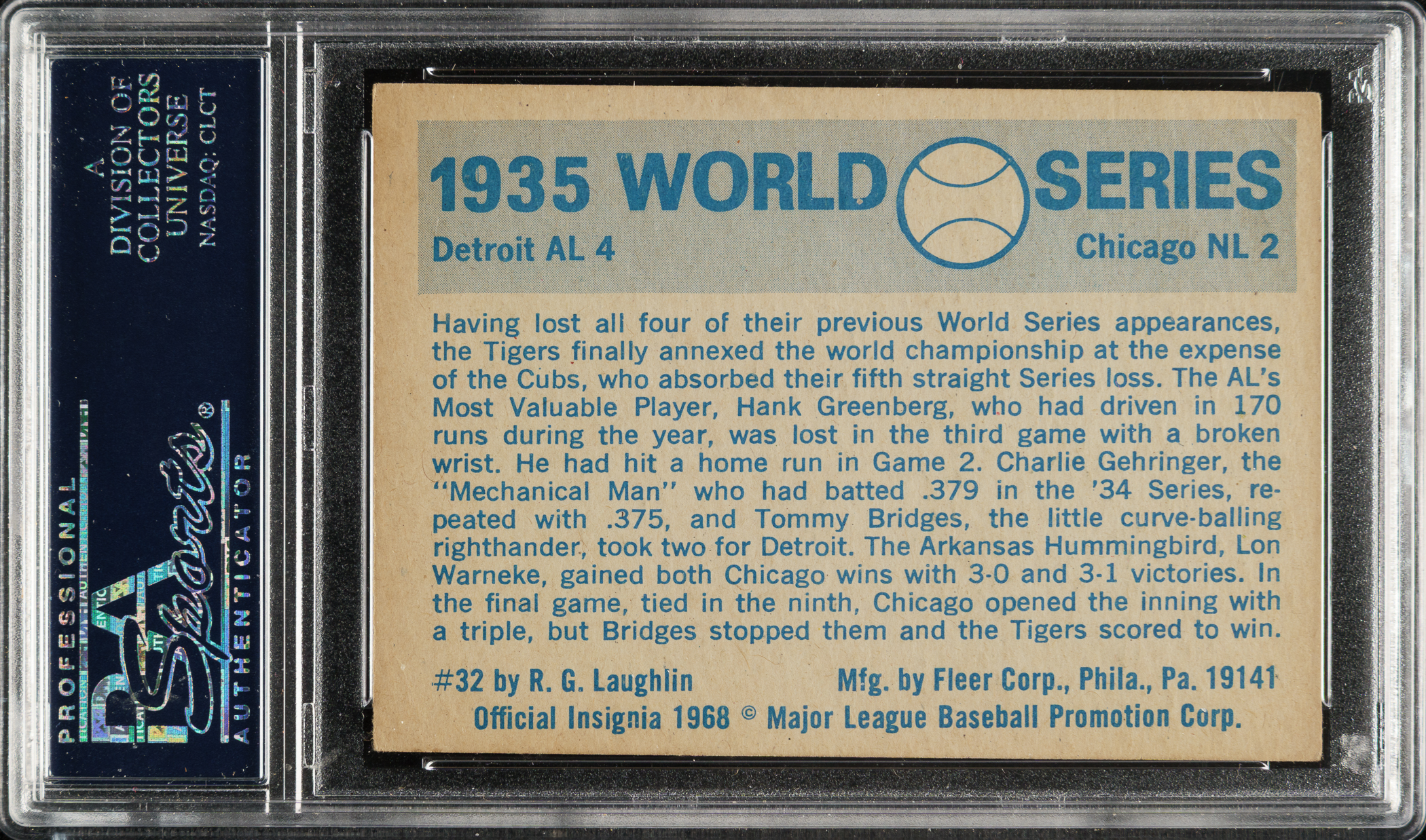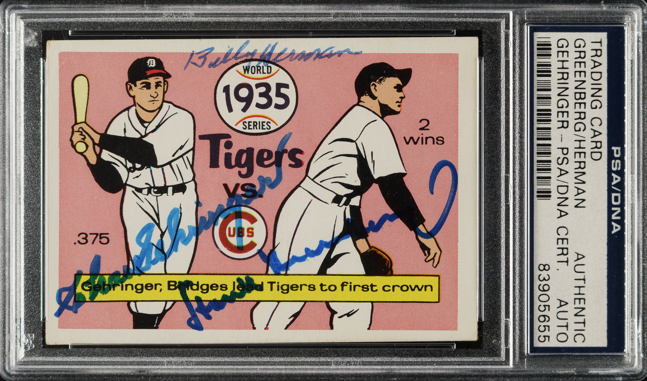 PSA/DNA has encapsulated the card and certified the signatures as "Authentic." Detroit Tigers and Chicago Cubs Hall of Famers Charlie Gehringer, Hank Greenberg, and Billy Herman.