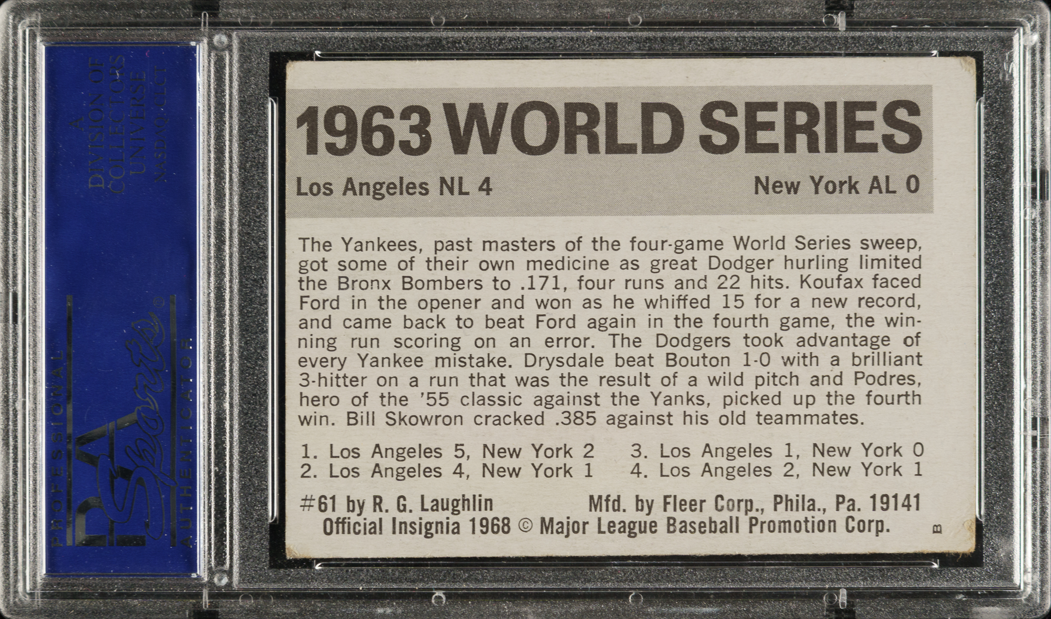 PSA/DNA has encapsulated the card and certified the signatures as "Authentic." Los Angeles Dodgers Hall of Famers Sandy Koufax and Don Drysdale, along with star pitcher Johnny Podres.