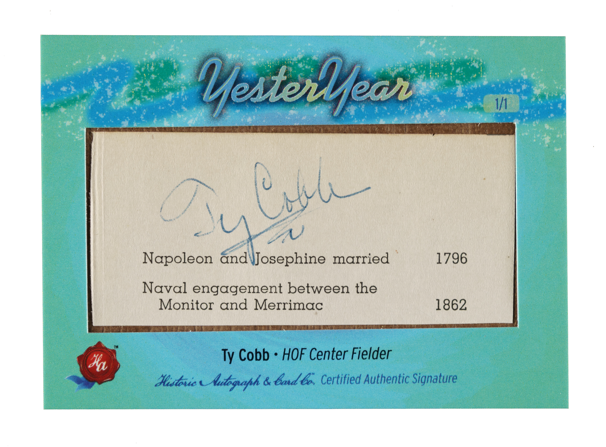 Cut signature of Detroit Tigers Hall of Famer Ty Cobb. Signed by Cobb in blue ink. The cut (3.75 x 1.25 inches) is in Very Good to Excellent condition overall.