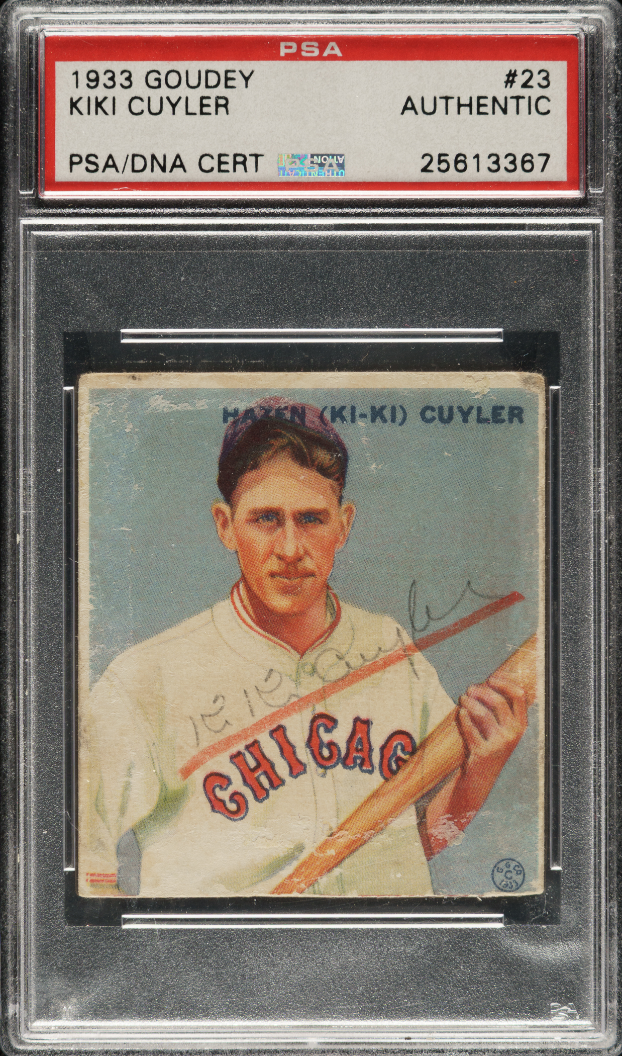 PSA/DNA has encapsulated the card and certified the signature as Authentic. Chicago Cubs Hall of Famer Kiki Cuyler. This is one of only nine signed examples of this particular card certified by PSA/DNA. This card originates from the John Laity Collection, as evidenced by the red line underneath the signature, which Mr. Laity added to cards prior to presenting them to ballplayers during the 1930s as a child growing up in New York and hunting autographs at subway stops heading to New York ballparks.