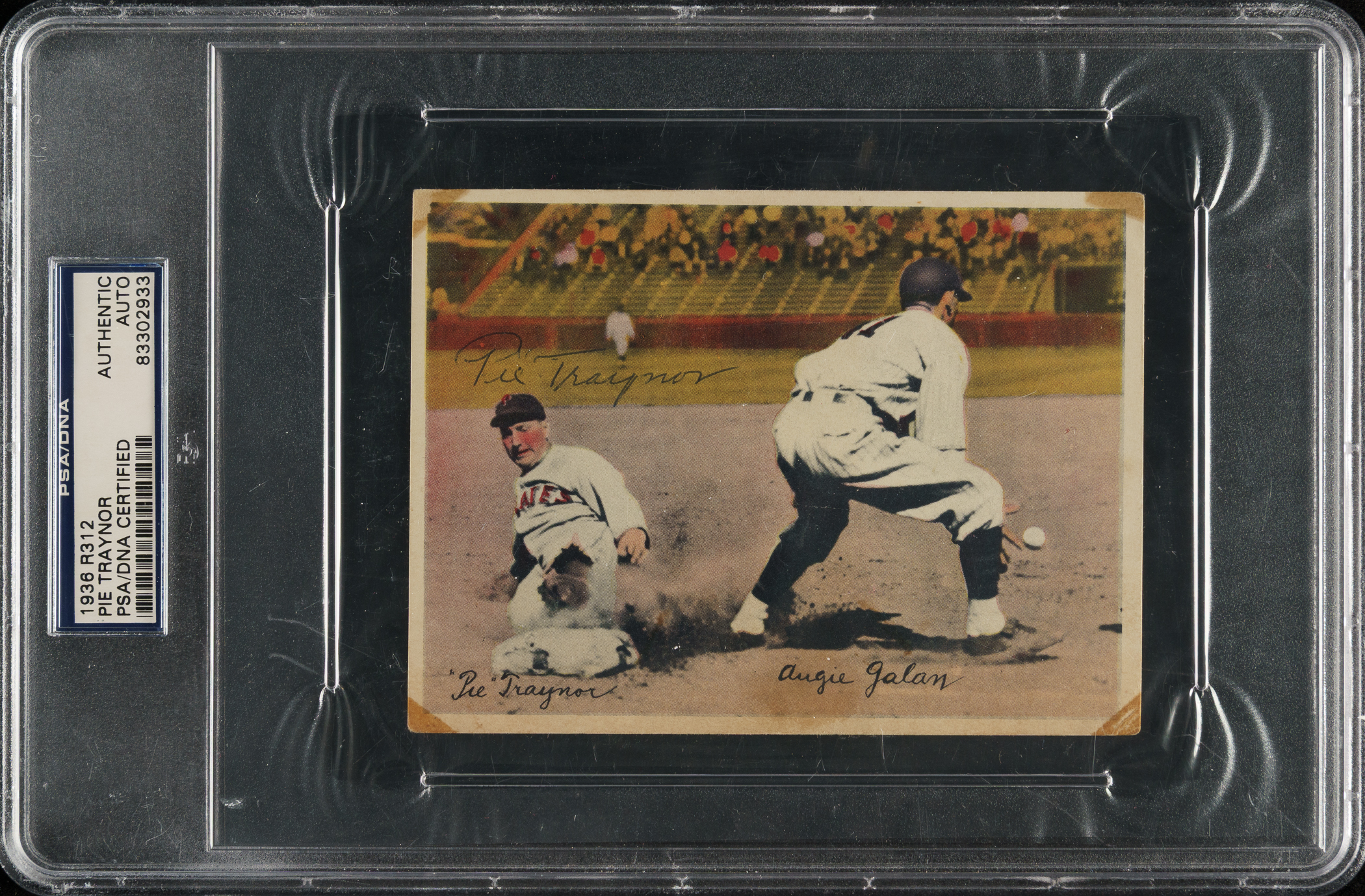 1936 R312 National Chicle Premium featuring Hall of Famer Pie Traynor and Augie Galan, signed by Traynor on the front. PSA/DNA has encapsulated the piece and certified the signature as "Authentic." This is the ONLY signed example of this card certified by PSA/DNA. This full-color (4 x 5.375 inches) premium set is composed of twenty-five individual player portraits, fourteen multiplayer cards, and eleven in-action photos. The beautiful, rich pastel colors of R312 premiums make them one of the most striking and distinctive of all 1930s issues. Considering how substantial they are, R312 premiums have received very little attention from collectors, in part due to the fact that they are larger than standard cards, and therefore have only recently begun to be encapsulated by grading services, and the fact that they are blank-backed with no identification of the issuer. This the first signed example of this particular Traynor premium we have ever offered and we cannot recall having seen another. The premium displays a tape stain in each corner, light creases, and minor toning on the reverse. In Fair to Good condition, but it displays at a much higher level than that suggested by its technically accurate grade.