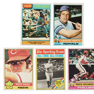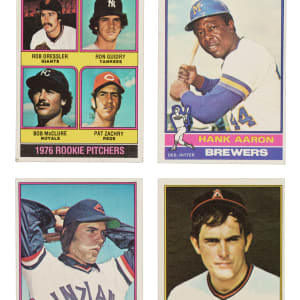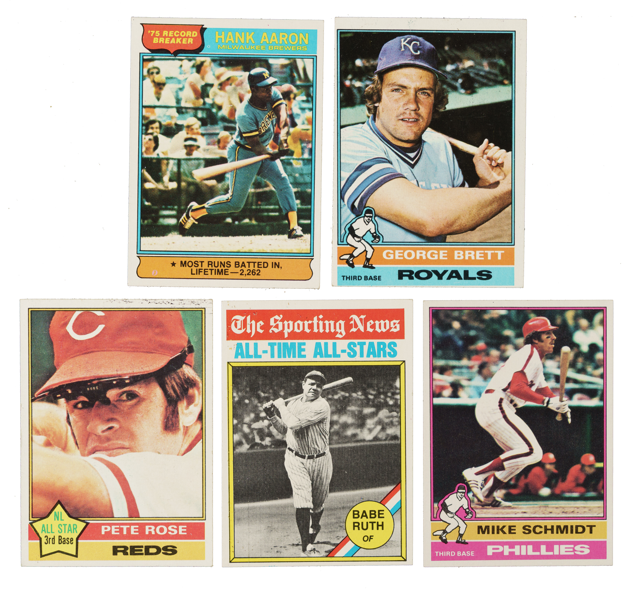 Presented is a very attractive 660-card complete set of 1976 Topps Baseball plus 44-card traded series. The set is highlighted by dozens of stars and Hall of Famers, including Nolan Ryan, George Brett, Dennis Eckersley (rookie), and the final card of Hank Aaron. Condition is 52% Nr/Mt to Nr/Mt-Mt, 38% Ex to Ex-Mt, and 10% Vg to Vg-Ex (including a few lesser). Condition of traded series is 25% Nr/Mt to Nr/Mt-Mt, 48% Ex to Ex-Mt, and 27% Vg to Vg-Ex. Keys: #1 Aaron RB (Ex), 19 Brett (10/90 L/R and 99/1 T/B, otherwise Ex), 98 Eckersley RC (Ex-Mt), 240 Rose (Ex), 330 Ryan (Ex), 345 Ruth ATAS (Ex-Mt), 480 Schmidt (Ex+), 550 Aaron (Vg-Ex+), and 599 Guidry RC (Vg). Many of the lesser grades are due to centering, which is a common problem with this issue. This is an outstanding mid- to high-grade 1976 Topps complete set with numerous highlights. Total: 704 cards.