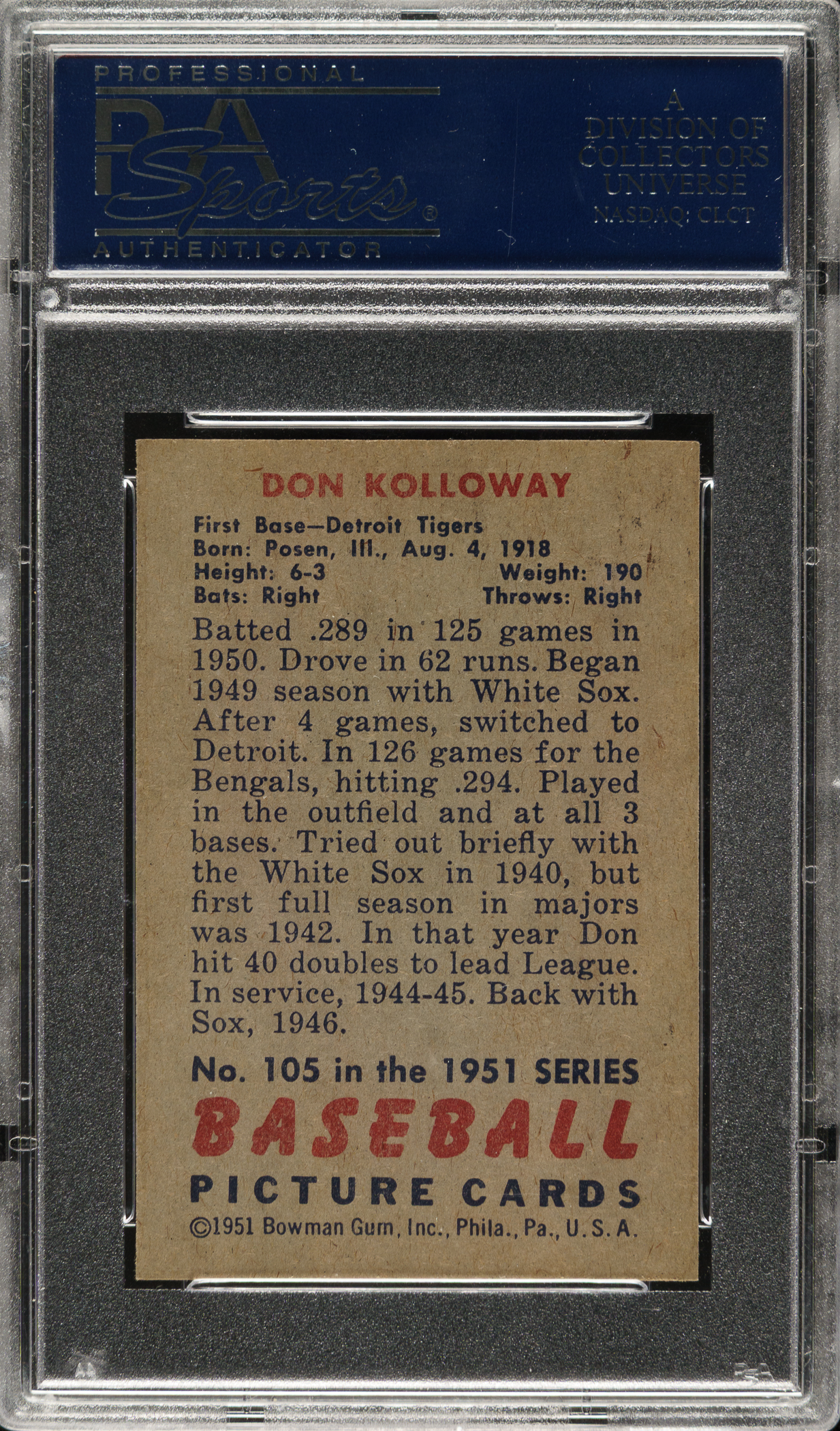 Lot # 1365: 1951 Bowman #105 Don Kolloway PSA NM-MT+ 8.5