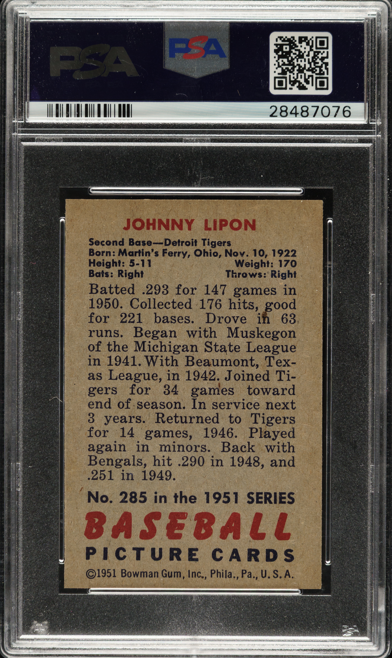 Lot # 1388: 1951 Bowman #285 Johnny Lipon PSA NM-MT 8