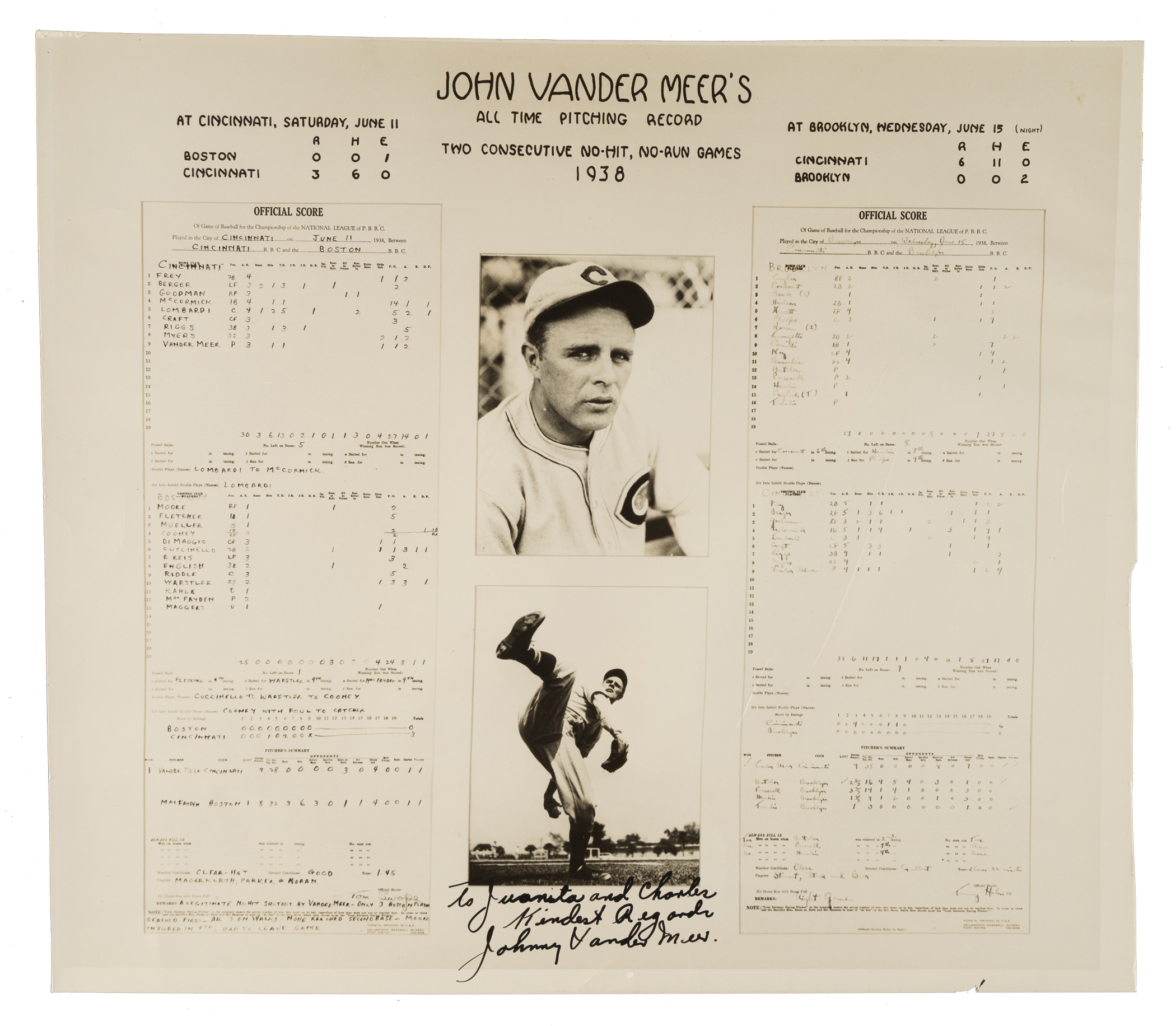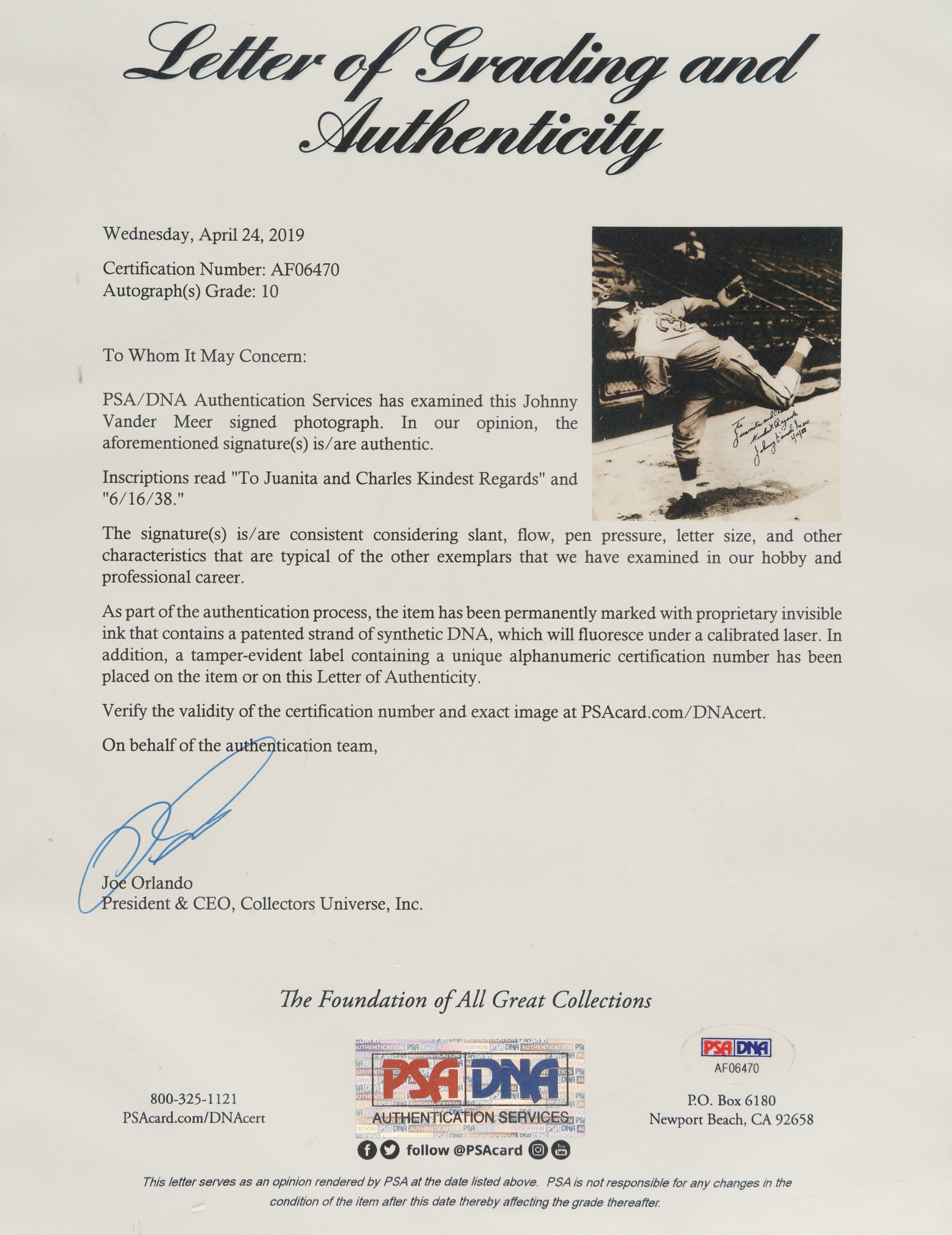 Large-format photo of Johnny Vander Meer (Cincinnati Reds) in a pitching pose. Vander Meer has inscribed the photo "To Juanita and Charles/Kindest Regards/Johnny Vander Meer/6-16-'38" in black ink below his image. PSA/DNA has graded the signature GEM MINT 10. The photo (13.5 x 15 inches; visible dimensions) is in apparent Very Good condition overall. Framed to total dimensions of 14.5 x 17 inches. From the Ruth Family collection. Full LOA from PSA/DNA. The size/weight of this item requires that there will be an additional shipping charge for this lot.