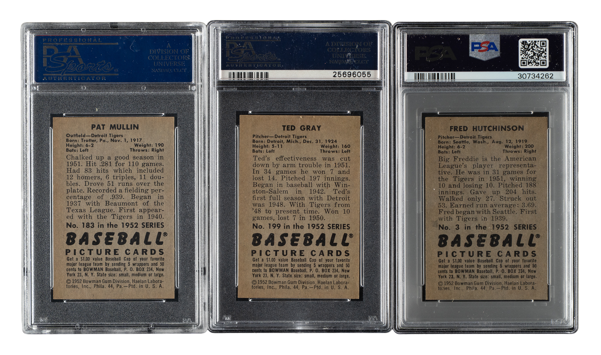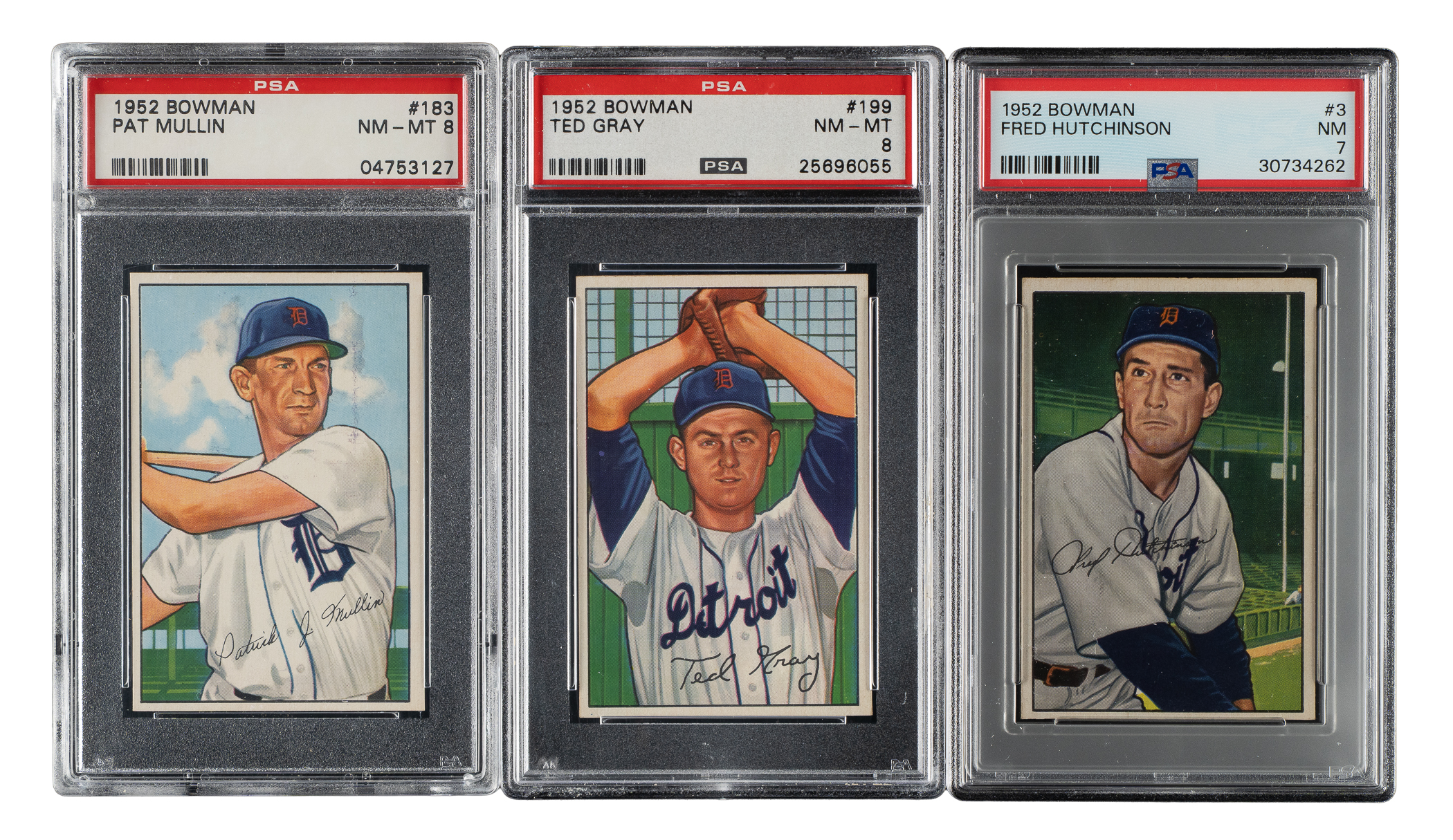 Lot # 1781: 1952 Bowman PSA-Graded Trio: Fred Hutchinson, Pat Mullin and Ted Gray