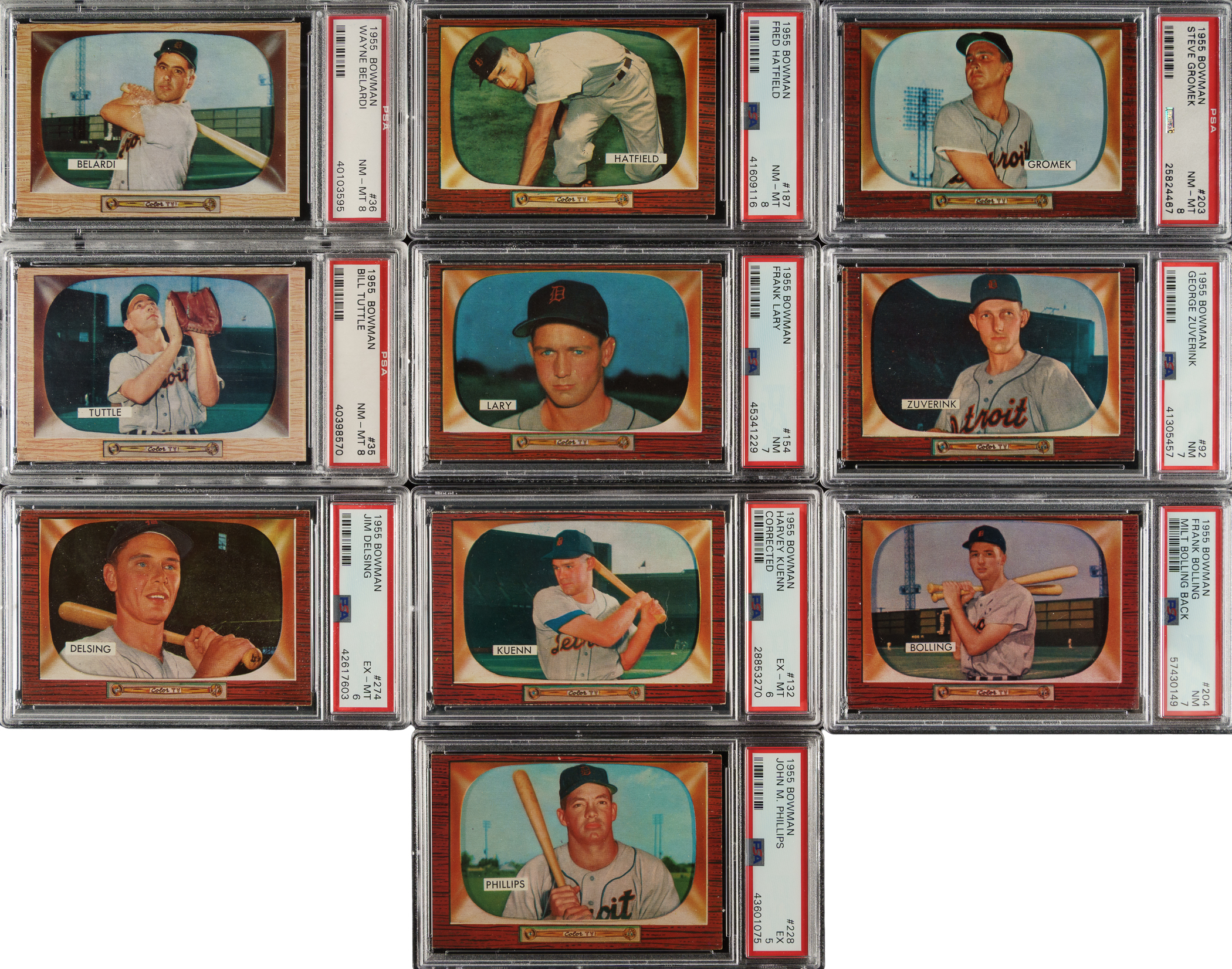 Collection of ten 1955 Bowman cards, each graded and encapsulated by PSA. PSA Grading Composite: NM-MT 8 (4 cards): #35, 36, 187, and 203. NM 7 (3 cards): #92, 154, and 204. EX-MT 6 (2 cards): #132 and 274. EX 5 (1 card): #228.