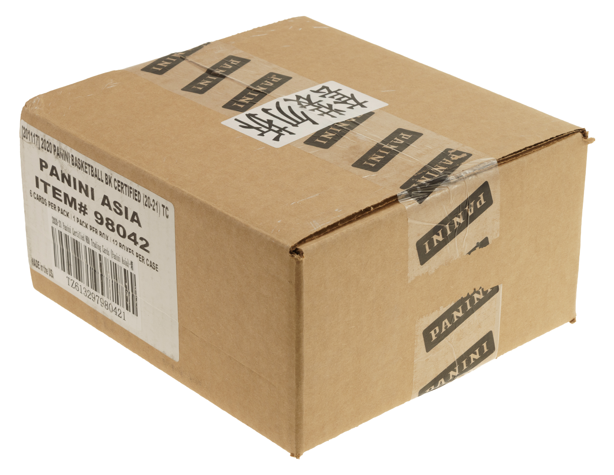 Presented is an unopened case of 2020-2021 Panini Certified basketball (Tmall edition) featuring 12 unopened boxes. The 2020-2021 Panini Certified set is highlighted by the rookie cards of Anthony Edwards, LaMelo Ball, and Tyrese Haliburton. Panini-Tmall cards are China-exclusive editions of standard Panini sets, sold through the Tmall platform. They feature the same base cards as their U.S. counterparts but include exclusive parallels and inserts only found in Tmall products. The case comes factory-sealed by Panini and displays light shelf wear. The size/weight of this item requires that there will be an additional shipping charge for this lot.