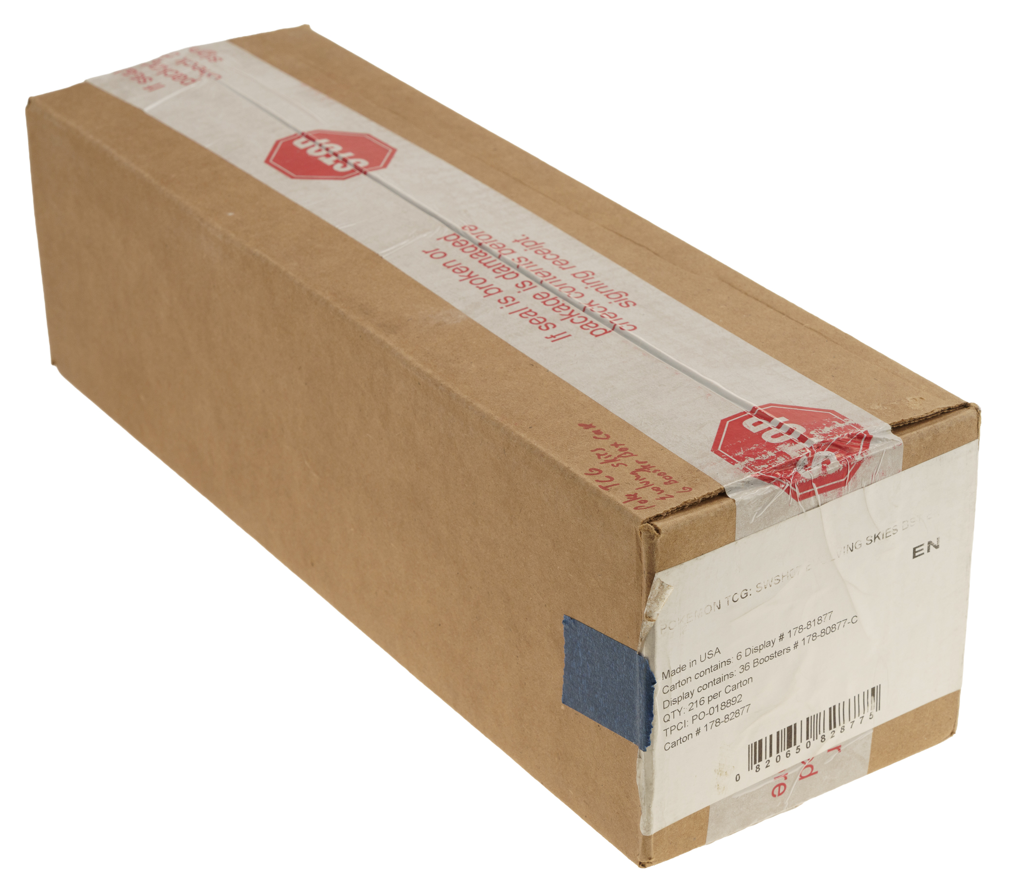 Extremely desirable factory-sealed booster box case from the 2021 Pokémon Sword & Shield Evolving Skies series. The case contains six unopened boxes, with 36 packs per box for a total of 216 packs. The 237-card Evolving Skies set is particularly significant in the Pokémon community as it features several of the most popular Eeveelution cards in existence, including the iconic Umbreon VMAX, famously known as "Moonbreon" in the collecting community. Other notable Pokémon with desirable cards in the series include Dragonite and Rayquaza. The original outer case displays minimal wear. The size/weight of this item requires that there will be an additional shipping charge for this lot.