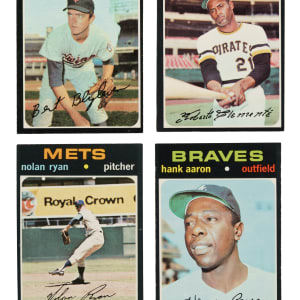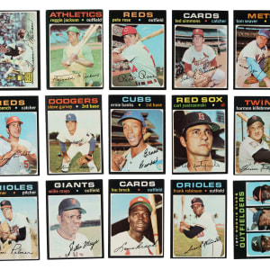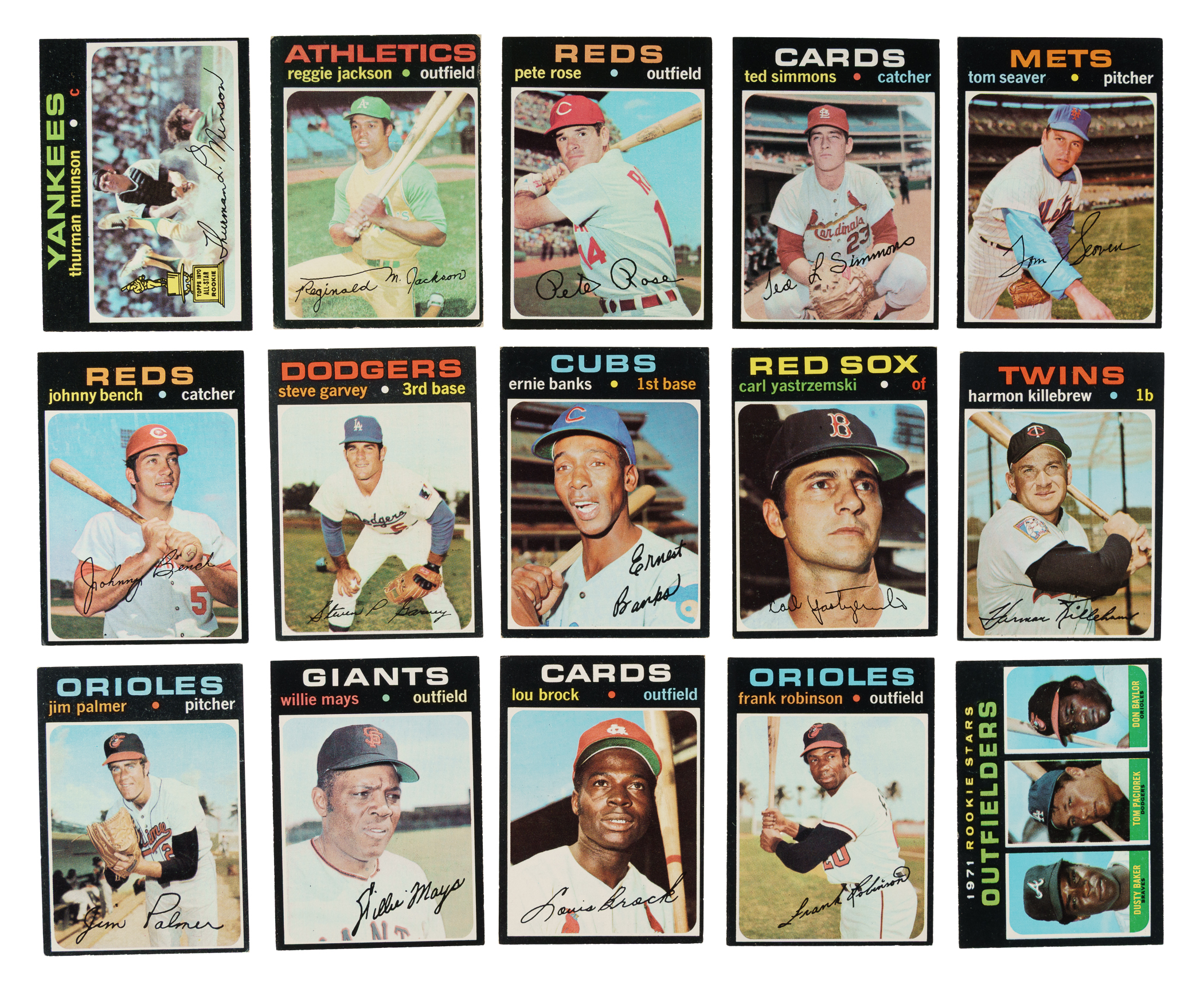 Crisp and clean 1971 Topps set, at 752 cards the largest set of Topps cards issued up to that time. The black flush-to-the-border design of the 1971 Topps set makes this issue particularly challenging to collect in extremely high grade. Condition is 25% Nr/Mt or better, 69% Ex to Ex-Mt, and 6% Vg to Vg-Ex (including a couple with a slight miscut, a few with a slight trim, and a few with color added). Keys: #5 Munson (Ex-Mt), 20 Jackson (Vg), 26 Blyleven RC (Ex-Mt), 100 Rose (Ex), 117 Simmons RC (Nr/Mt+), 160 Seaver (Nr/Mt), 250 Bench (Ex-Mt), 341 Garvey RC (Ex-Mt), 400 Aaron (Ex-Mt due to centering), 513 Ryan (Ex+), 525 Banks (Vg-Ex+), 530 Yastrzemski (Ex), 550 Killebrew (Ex), 570 Palmer (Vg-Ex), 600 Mays (Ex-Mt), 625 Brock (measures a bit small, otherwise Vg-Ex), 630 Clemente (Ex-Mt), 640 F. Robinson (Ex+), and 709 Baylor/Baker RC (Ex-Mt). Extremely attractive mid- to high-grade complete set. Total: 752 cards.