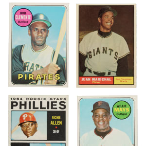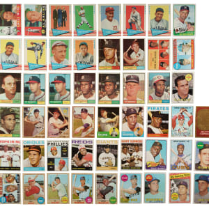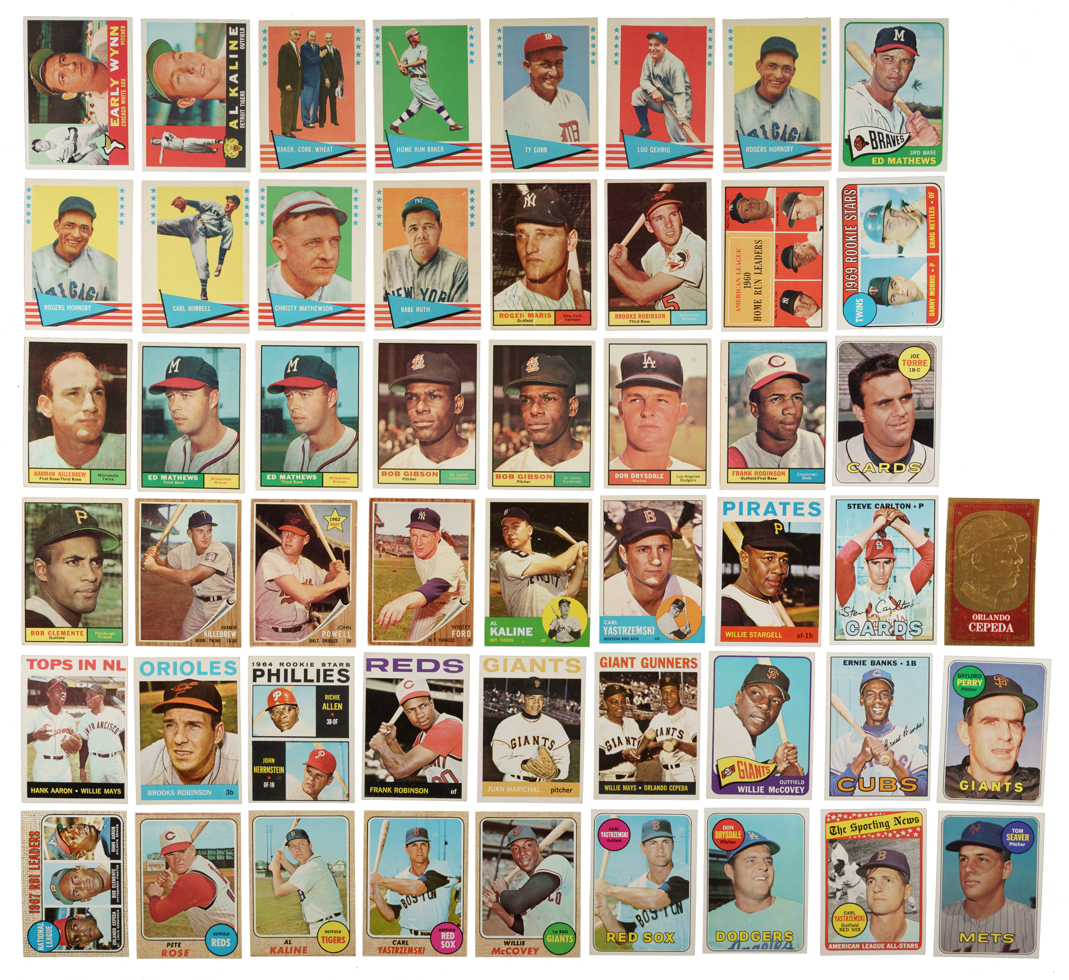 Shoebox collection of 774 Topps and Fleer baseball cards spanning the years 1960 to 1969 and highlighted by seventy-six Hall of Famers (not including the 1961 Fleer Baseball Greats which consist mostly of HOFers), including Roberto Clemente, Eddie Mathews, Rollie Fingers (rookie), Al Kaline, and Willie Mays. This collection consists of the following: 1) 1960 Topps (11 cards): Condition ranges from Vg-Ex to Ex-Mt (averaging Ex), with one Vg. Includes: #1 Wynn (Vg-Ex), 18 Dodgers Team, 50 Kaline (Vg-Ex+), 109, 155, 175, 504, 510, 515, 521, and 539. 2) 1961 Topps (134 cards): Condition is 19% Ex-Mt or slightly better, 51% Vg-Ex to Ex, and 30% Gd to Vg (including a couple lesser). Keys: #2 Maris (Pr), 10 B. Robinson (Vg), 20 Roberts (Vg), two 41 NL Batting Ldrs (both Ex+), 44 AL HR Ldrs (Ex), 80 Killebrew (Vg-Ex), two 89 Martin, two 106 Herzog, two 120 Mathews (Ex-Mt and Vg), 207 Koufax/Podres (Ex-Mt), two 211 Gibson (Ex and Vg-Ex+), 260 Drysdale (Ex), 360 F. Robinson (90/10 L/R, otherwise Vg), 388 Clemente (Vg), two 404 Hornsby Tops NL, 409 Johnson Hurls Shutout, 417 Marichal RC (Ex), and 430 Mazeroski (Gd). 3) 1961 Fleer Baseball Greats (50 cards): Condition ranges from Vg-Ex to Ex-Mt (averaging Ex), with a few lesser and a couple Nr/Mt. Includes no cards from the high-number series (#89-154). Keys: #1 Baker/Cobb/Wheat (pen checklist marks on reverse, otherwise Ex-Mt), 6 Baker, 14 Cobb (Ex-Mt), 31 Gehrig (Vg-Ex), two 43 Hornsby (Ex+ and Vg-Ex), 45 Hubbell (Vg due to centering), 59 Mathewson (Ex), and 75 Ruth (Vg). 4) 1962 Topps (34 cards): Condition ranges from Vg to Ex (averaging Vg-Ex), with one Ex-Mt and a couple lesser. Keys: #28 Minoso (Vg), 29 Stengel (Ex+), 70 Killebrew (Ex-Mt), 99 Powell RC (Vg-Ex), 213 Ashburn (Vg), 234 WS Gm. 3 - Maris (Vg), 310 Ford (Vg-Ex), 468 B. Robinson AS (Vg-Ex), and 470 Kaline AS (Pr due to back damage). 5) 1963 Topps (58 cards): Condition ranges from Vg to Ex-Mt (averaging Vg-Ex/Ex), with a couple lesser. Keys: #25 Kaline (Ex), 54b DeBusschere RC/1963, 108 Wilhelm (Vg+), 115 Yastrzemski (slight trim, otherwise Nr/Mt), 165 Kaat, 169 Perry (Vg), 190 Minoso, and 323 Mazeroski. 6) 1964 Topps (199 cards): Condition is 35% Ex to Ex-Mt (including some Nr/Mt) and 65% Vg to Vg-Ex (including a few lesser). Keys: #11 NL RBI Ldrs (Vg), 13 Wilhelm (Vg-Ex), 101 Alston (Fr), 103 Flood, 116 Oliva (Vg-Ex), 136 WS Gm. 1 - Koufax (Gd), 230 B. Robinson (Vg-Ex), 232 Lopez, two 243 Allen RC (both Vg-Ex+), 260 F. Robinson (Vg), 280 Marichal (Vg-Ex+), 306 Mays/Cepeda (Vg), two 331 AL Bombers with Maris/Mantle/Kaline (Ex and Vg-Ex), 342 Stargell (Vg-Ex), 375 Santo (Vg-Ex), 423 Aaron/Mays (Vg), 476 Carty RC (Nr/Mt), 538 Minoso, 550 Hubbs Memorial (Ex-Mt), and 570 Mazeroski (Ex-Mt). 7) 1965 Topps (75 cards): Condition ranges from Ex to Nr/Mt-Mt, with a few slightly lesser. Keys: #3 AL HR Ldrs w/ Killebrew & Mantle (Nr/Mt), 6 NL RBI Ldrs, 176 McCovey (Vg+), 193 Perry (Nr/Mt), 220 B. Williams, 266 Campaneris RC (Nr/Mt), and 500 Mathews (Ex). 8) 1965 Topps Embossed (2 cards): #9 (Vg) and 45 Cepeda (Ex+). 9) 1966 Topps (18 cards): Condition ranges from Ex to Nr/Mt (averaging Ex-Mt), with a couple slightly lesser. Includes: #8, 49, 104, 113, 123, 138, 139, 147, 181, 220, 295, 339, 340, 375, 433, 454, 476, 504, and 516. 10) 1967 Topps (2 cards): #146 Carlton (Ex) and 215 Banks (Ex). 11) 1968 Topps (150 cards): Condition is 8% Nr/Mt, 58% Ex to Ex-Mt, and 34% Vg to Vg-Ex (including a few lesser and one miscut). Keys: #3 Cepeda/Clemente/Aaron (Ex-Mt), 205 Marichal (Ex), 215 Bunning (Ex), 225 Allen, 230 Rose (Ex), 240 Kaline (Ex), 250 Yastrzemski (Nr/Mt), 290 McCovey (Nr/Mt), 450 Kaat (Vg+), and 571 La Russa. 12) 1969 Topps (41 cards): Condition ranges from Vg-Ex to Nr/Mt (averaging Ex/Ex-Mt). Keys: #10, 50 Clemente (wax on reverse, otherwise Ex), 99b Nettles RC/no loop, 130 Yastrzemski (slightly miscut left edge, otherwise Ex), 165 WS Gm. 4 - Brock HR, 190 Mays (Vg-Ex+), 385 Cepeda (Ex), 400 Drysdale (Ex), 425 Yastrzemski AS (Ex-Mt), 460 Torre, 480 Seaver (Vg-Ex+), 485 Perry (Nr/Mt), and 597 Fingers RC (Nr/Mt). This is a very substantial collection of cards with many notable highlights from these popular 1960s Topps sets! Total: 774 cards.