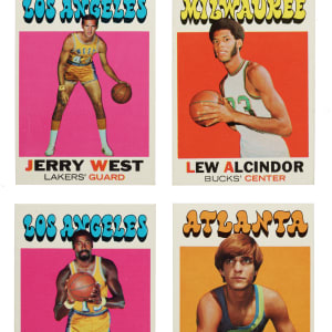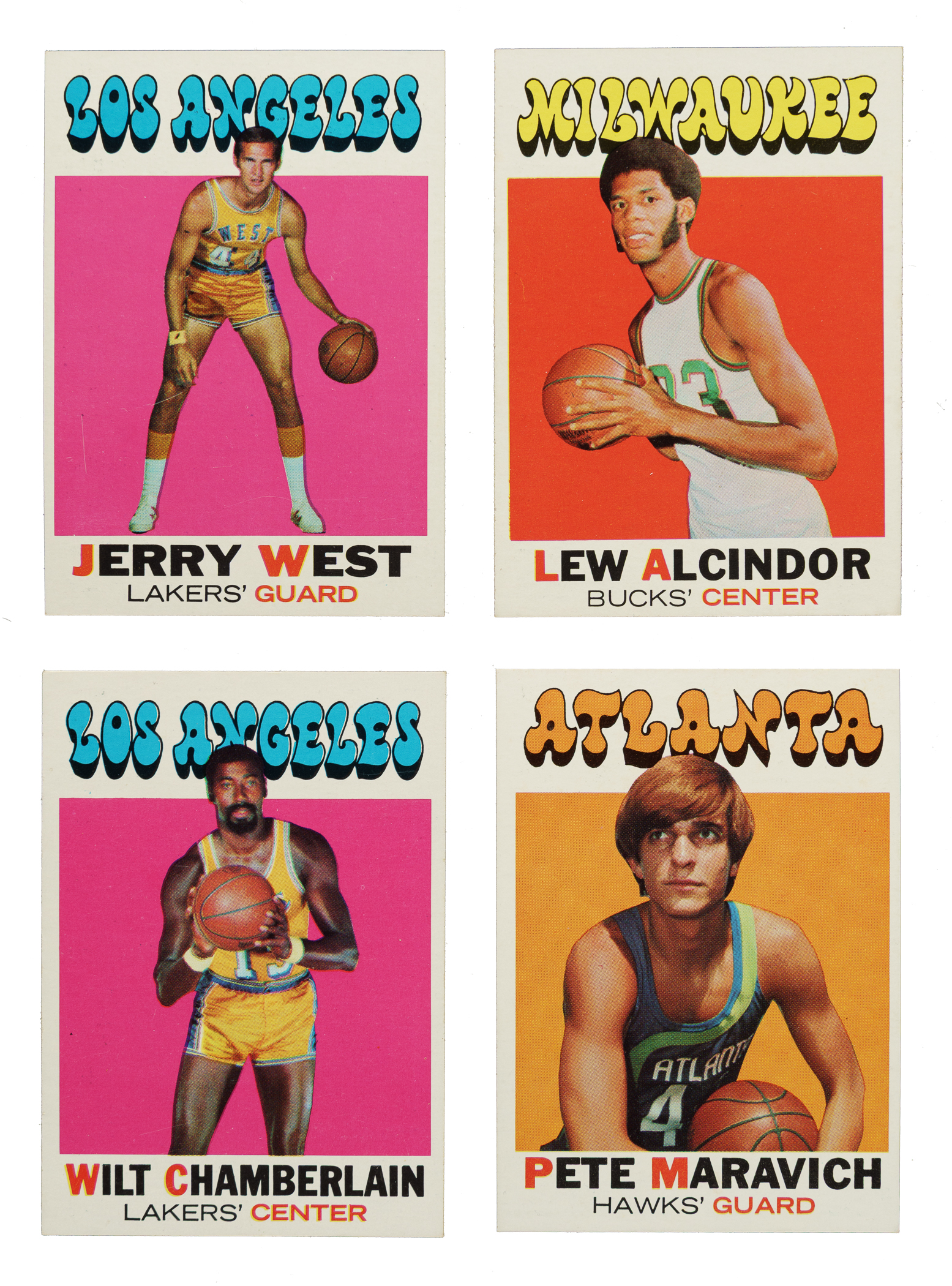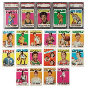 Outstanding complete set of 1971-1972 Topps basketball cards, consisting of 233 different cards. The 1971-1972 Topps set is very popular among collectors for its bright colors and funky text, both telltale signs of an early 1970s issue. The set is loaded with stars and Hall of Famers, including Pete Maravich, Oscar Robertson, and rookie cards of Rick Barry, Dave Cowens, Bob Lanier, Larry Brown, Nate Archibald, and Dan Issel. This was also the first year that Topps included cards of ABA (American Basketball Association) players. Condition is 40% Nr/Mt to Nr/Mt-Mt (including a few Mint), 44% Ex to Ex-Mt, and 16% Vg to Vg-Ex (including a couple lesser, a few that measure small, and a few with a slight trim). Five cards have been professionally graded and encapsulated by PSA. Keys: #1 Robertson (Ex+), 2 Bradley (NM-MT 8), 4 (NM-MT 8), 10 Baylor (Ex), 20 Haywood RC (Ex), 29 Archibald RC (Ex), 35 Havlicek (Vg-Ex+), 47 Cowens RC (Ex-Mt), 50 West (Nr/Mt), 55 Maravich (Nr/Mt), 58 Murphy (NM-MT 8), 63 Lanier RC (Ex-Mt), 65 Frazier (Vg-Ex+), 70 Chamberlain (Ex-Mt), 91 Tomjanovich RC (NM-MT 8), 100 Alcindor (Nr/Mt), 120 Hayes (Nr/Mt+), 125 (NM-MT 8), 138 NBA Scoring Ldrs (measures a bit small, otherwise Nr/Mt), 152 L. Brown RC (Ex), 170 Barry RC (Nr/Mt+), 195 Daniels RC (Nr/Mt), 200 Issel RC (Vg-Ex+), 224 Dampier RC (Nr/Mt), and 225 R. Brown RC (Nr/Mt+). An extremely attractive mid- to high-grade complete set of this popular 1970s Topps basketball issue, loaded with stars and Hall of Famers. Total: 233 cards.
