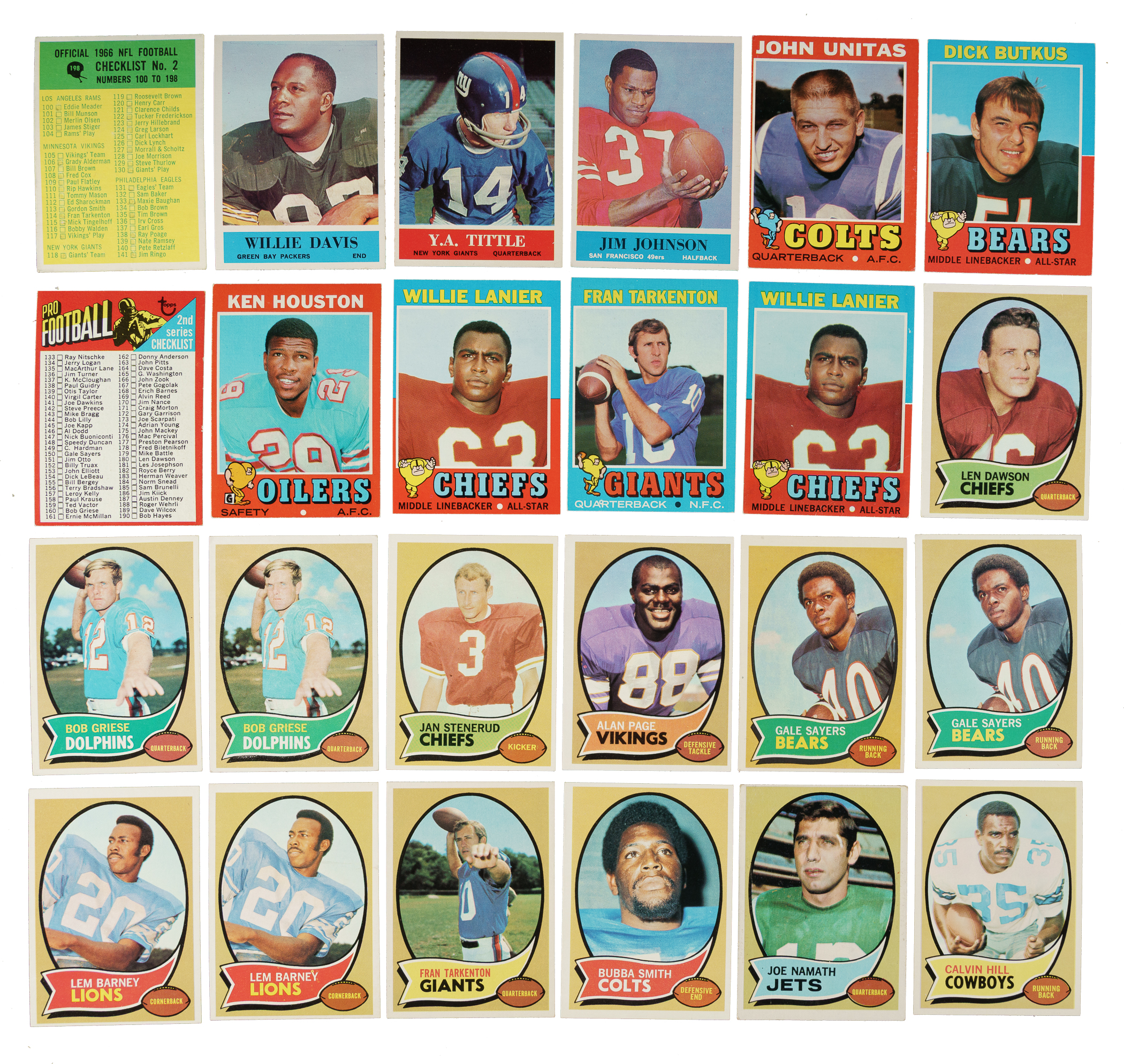 Very substantial shoebox collection of 1,938 cards from twenty-eight different Topps, Bowman, Philadelphia, Fleer, and Post Cereal football-card sets spanning the years 1950 to 1973. The collection is highlighted by 320 Hall of Famers, including Jim Brown, Johnny Unitas, Bart Starr, and Frank Gifford. This collection consists of the following: 1) 1950 Bowman (2 cards): #56 (Ex+) and 77 (Ex). 2) 1951 Bowman (22 cards): Condition ranges from Pr to Vg (averaging Gd), with a couple better. Includes: #8, 33, 41, 50, 51, two 54, 58, 60, 61, 62 Creekmur RC (Vg), 67, 68, 82, 85, 91 Tunnell RC (Gd), 95, 97, 103, 123, 136, and 137 Trippi (Vg). 3) 1952 Bowman Small (1 card): #35 (Vg+). 4) 1952 Bowman Large (3 cards): #60 (Vg), 103 (85/15 T/B, otherwise Ex+), and 107 (Vg-Ex). 5) 1954 Bowman (10 cards): Condition ranges from Vg to Ex (averaging Vg-Ex. Includes: #16, 17, 51, 63, 64, 67, 73, 79, 90, and 111 Lavelli. 6) 1955 Bowman (7 cards): #16 Conerly (Vg-Ex), 33 (Vg), 42 Johnson RC (Vg-Ex+), 44 Perry (Vg-Ex+), 45 (Vg-Ex), 82 Richter (Ex), and 160 (Vg+). 7) 1955 Topps All-American (1 card): #76 (Ex+). 8) 1956 Topps (47 cards, 46 different): Condition ranges from Gd to Ex (averaging Vg/Vg-Ex), with one Fr. Keys: #8 Creekmur, 20 Christiansen, 28 Bednarik (Ex+), 44 Schmidt RC (Vg+), 50 McElhenny, 60 Moore RC (Vg), 61 Redskins Team SP (Vg-Ex), 74 Nomellini, 78 Hirsch, 87 Stautner, 94 SP, and 109 SP. 9) 1958 Topps (89 cards, 60 different): Condition ranges from Vg to Ex-Mt (averaging Vg-Ex/Ex), with a couple higher and lower. Keys: Two #2 Layne (Ex and Vg+), two 3 Schmidt, 10 Moore, two 15 Robustelli, 16 Marchetti, two 32 Dillon, two 35 Bednarik, 59 McCormack, 66 Starr (20/80 L/R, otherwise Ex-Mt), 70 Christiansen, 76 Butler, two 84 Conerly, three 86 Tittle (two Ex and Vg+), three 89 Nomellini, 93 Perry, two 102 Brown, three 120 Berry (Ex-Mt and two Ex), 122 McElhenny, and two 129 Blanda (Ex and Vg). 10) 1959 Topps (89 cards, 87 different): Condition ranges from Vg to Nr/Mt (averaging Ex), with a few lesser. Keys: #1 Unitas (Fr), 10 Brown (Vg), 20 Gifford (Pr due to pen on front), 22 Butler, 23 Starr (Pr-Fr), 40 Layne (Vg+), 44 Johnson, 58 St. Clair, 60 Groza, 65 Conerly, 75 Ringo, 82 Hornung (Vg), 96 Jones, 100 Moore, 109 Marchetti, 114 R. Brown, 130 Tittle (Vg-Ex), 131 Lary, 132 Parker RC (Ex), 140 Mitchell RC (Vg+), 147 Robustelli, and 155 Taylor RC (Vg-Ex). 11) 1960 Topps (59 cards, 51 different): Condition ranges from Vg to Nr/Mt (averaging Ex+). Keys: #3 Moore, two 4 Berry, 17 Jones, 46 Schmidt, 48 Lary, two 54 Hornung (Nr/Mt and slighty miscut, otherwise Vg-Ex), 72 Conerly, 81 Robustelli, three 93 Layne (Nr/Mt and two Vg-Ex), two 116 McElhenny, 118 St. Clair, 121 Nomellini, and 132 Redskins (Ex). 12) 1960 Fleer (51 cards, 41 different): Condition ranges from Vg-Ex to Nr/Mt (averaging Ex/Ex-Mt), with a few slightly lesser. Keys: #7 Gillman (Vg+) and 124 Kemp RC (Ex-Mt). 13) 1961 Topps (83 cards, 72 different): Condition ranges from Vg to Nr/Mt (averaging Ex), with a few lesser. Keys: #1 Unitas (Gd+), 2 Moore, 14 Jones, 44 Ringo, 50 Matson, 58 Tittle (Ex), 67 Checklist (Ex), 70 Mitchell, 79 McElhenny, 85 Conerly, two 90 Robustelli, two 95 Jurgensen (Ex and Vg), and 105 Johnson. 14) 1961 Fleer (25 cards, 21 different): Condition is Vg to Vg-Ex, with a couple Ex. 15) 1962 Fleer (55 cards, 51 different): Condition ranges from Vg to Ex-Mt (averaging Vg-Ex), with a couple Nr/Mt and a few lesser. Keys: #16 Shaw RC (Ex), 46 Blanda (Ex), 68 Flores (Ex-Mt), and 79 Kemp (Ex). 16) 1962 Post (27 cards, 13 different): Without reference to the neatness of the hand cuts, the condition ranges from Pr to Vg-Ex (averaging Gd). Keys: #38 McDonald, 52 Lary, and two 162 Lundy. 17) 1963 Topps Partial Set (107/170) Plus 12 Duplicates: Condition ranges from Vg-Ex to Nr/Mt (averaging Ex+), with a few lesser. Keys: #2 Moore, 5 Parker, 8 Marchetti, 17 McCormack, two 19 Groza, three 32 Lane, 33 Lary, 44 Jones RC (Vg), 59 Huff, 86 Starr (Ex), two 89 Gregg, 95 Wood RC (Vg-Ex), 103 McElhenny, two 107 Marshall RC (Ex+ and Vg-Ex), two 123 Johnson, 129 Stautner, two 134 Brodie, 140 St. Clair, 143 Nomellini, four 155 Wilson RC (Nr/Mt, Ex-Mt+, Ex-Mt, and Vg-Ex+), and 159 Mitchell. 18) 1964 Topps Partial Set (103/176) Plus 13 Duplicates: Condition ranges from Vg-Ex to Nr/Mt (averaging Ex/Ex-Mt), with a few lesser. Keys: #3 Buoniconti, 38 Shaw, 82 Checklist (partially erased marks, otherwise Vg+), 92 Buchanan RC (Ex), 125 Snell RC, 155 Alworth (Ex-Mt), 159 Hadl RC (Ex-Mt due to centering), and 176 Checklist (marked, otherwise Vg). 19) 1964 Philadelphia (100 cards, 74 different): Condition is 80% ranging from Ex to Nr/Mt (including a few Nr/Mt-Mt) and 20% Vg to Vg-Ex. Keys: #8 Parker, 15 Atkins, two 50 McDonald, 62 Lary, two 66 Schmidt, 72 Davis RC (Ex), 73 Gregg, two 75 Jordan, two 76 Kramer, 78 Ringo, 89 Gabriel, 114 R. Brown, 124 Tittle (Ex+), and 161 Johnson RC (Ex). 20) 1965 Philadelphia Partial Set (127/198) Plus 15 Duplicates: Condition is 21% Ex-Mt to Nr/Mt, 65% Vg-Ex to Ex, and 14% Gd to Vg (including a couple lesser). Keys: #2 Berry, three 10 Parker, 19 Ditka (Ex-Mt), two 49 McDonald, 63 Lary, two 75 Gregg, two 76 Hornung (Ex-Mt and Ex), 81 Starr (Ex-Mt), 87 Gabriel, two 89 Jones, 105 Eller RC (Vg), 147 J. H. Johnson, 176 Jim Johnson, two 187 Huff, 188 Jurgenson, 189 Krause RC (Vg-Ex+), and 191 Mitchell. 21) 1966 Philadelphia (99 different cards): Condition ranges from Vg to Ex-Mt (averaging Vg-Ex/Ex), with a couple slightly higher and lower. Keys: #1 Falcons, 18 Mackey, 21 Moore, 60 Lilly, 61 Meredith, 63 Renfro, 69 Karras, 85 Gregg, 97 McDonald, 102 Olsen, 114 Tarkenton (Vg), 115 Tingelhoff, 185 Jurgensen (Ex-Mt), 197 Checklist 1 (Ex), and 198 Checklist 2 (marked, otherwise Vg+). 22) 1967 Topps (10 cards): Condition ranges from Vg-Ex to Nr/Mt (averaging Ex/Ex-Mt), with one Vg. Includes: #8, 9, 50, 68, 70, 76, 94, 96, 109, and 129. 23) 1969 Topps (9 different cards): Condition ranges from Vg-Ex to Nr/Mt (averaging Ex/Ex-Mt). Ke