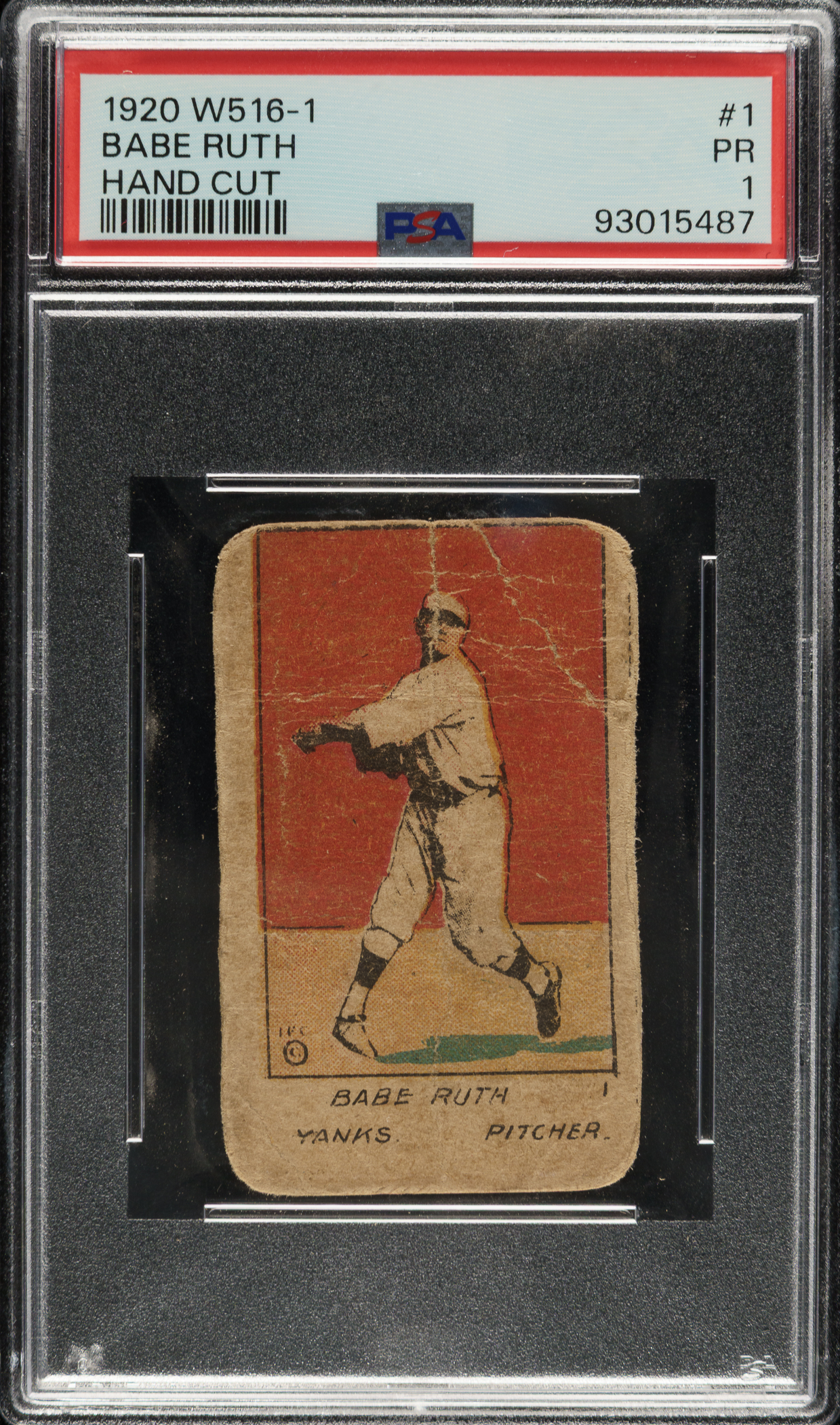 Offered is an example of Babe Ruth from the W516-1 strip-card series. Ruth is depicted in a pitching pose as a member of the New York Yankees. This classic 1920-era strip-card issue consists of 10 cards, and Babe Ruth is unquestionably the key card. Originally issued in strips, these cards (and almost all strip-cards) are often found with irregular borders as they were cut by hand from the strips, as intended. Only ideally cut examples (which are few and far between) are awarded numerical grades by PSA (and SGC). Encapsulated as Authentic by PSA, the offered example displays heavy creasing and rounded corners. Despite its flaws, this remains a very presentable example of Babe Ruth's most classic 1920s strip-card and one that would be a significant addition to any Babe Ruth, strip-card, or prewar-card collection.