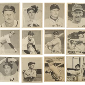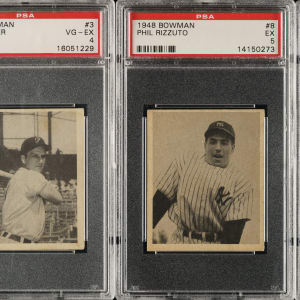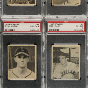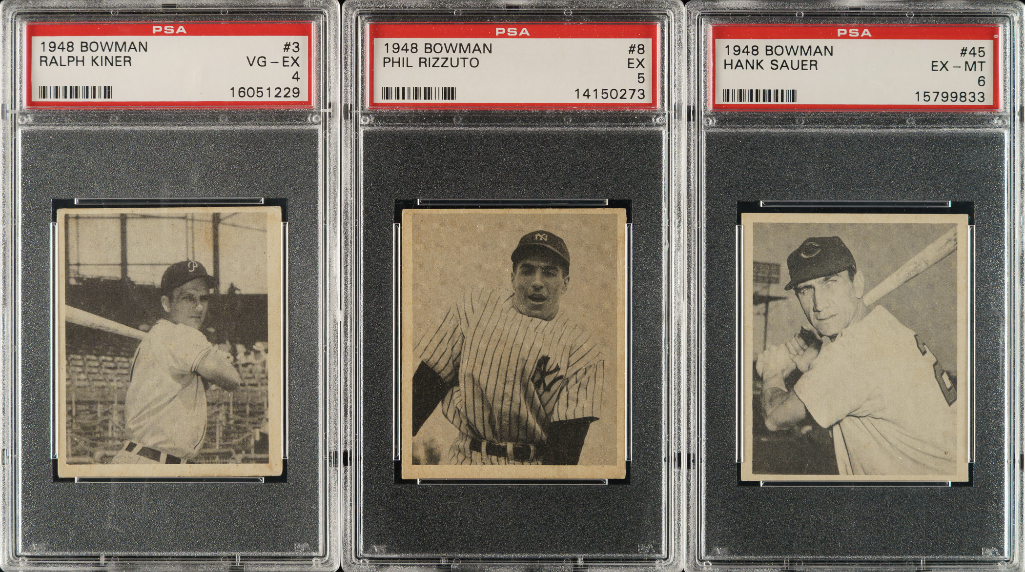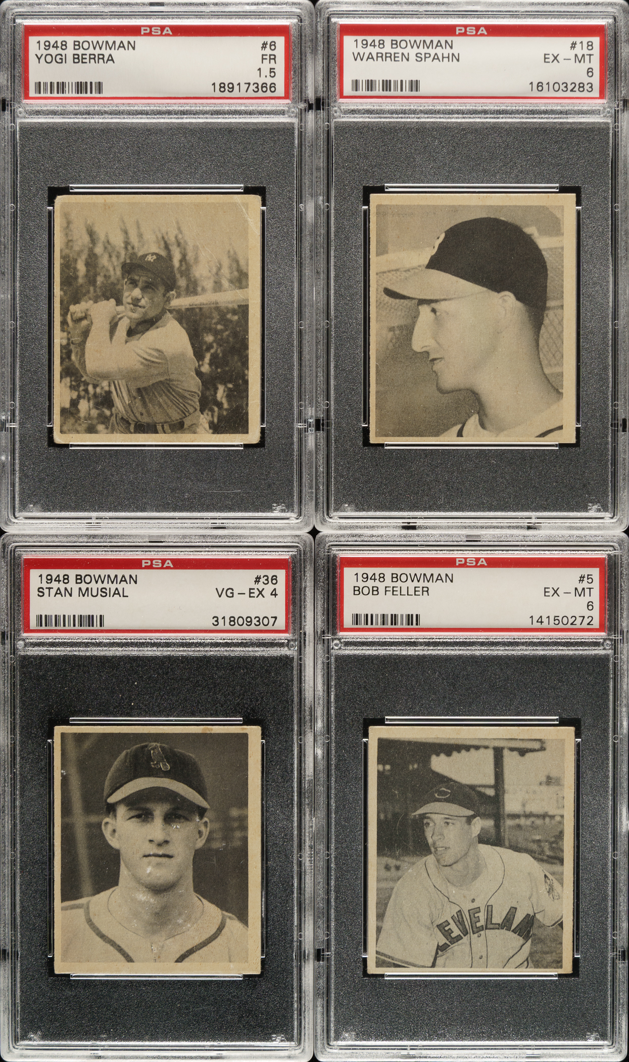 Offered is a complete set of 48 cards from the 1948 Bowman series, the first baseball-card set issued by Bowman Gum, highlighted by key rookie cards of many stars and Hall of Famers. Condition is 45% Ex to Ex-Mt (approximately two-thirds Ex), 42% Vg to Vg-Ex, and 13% lesser. Seven cards have been professionally graded and encapsulated by PSA. Keys: #1 Elliott RC (Vg), 2 Blackwell (Vg+), 3 Kiner RC (VG-EX 4), 4 Mize (Ex), 5 Feller (EX-MT 6), 6 Berra RC (FAIR 1.5), 7 Reiser SP (Ex), 8 Rizzuto RC (EX 5), 12 Sain RC (Ex), 14 Reynolds RC (Ex), 17 Slaughter RC (Vg), 18 Spahn RC (EX-MT 6), 19 Henrich (Vg-Ex+), 29 Page RC (Ex due to centering), 30 Lockman SP (Vg), 36 Musial RC (VG-EX 4), 38 Schoendienst (Gd), 40 Marion RC (Gd), 45 Sauer RC (EX-MT 6), and 47 Thomson RC (Vg). An outstanding opportunity to acquire a complete set of this landmark Bowman issue. The SMR value for just the seven graded cards (factoring in the half grade at the lower whole-grade level) is $2,885. Total: 48 cards.
