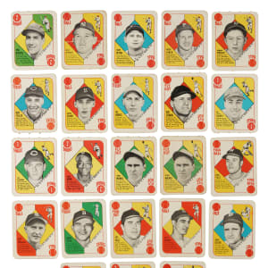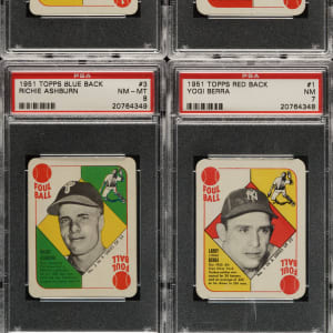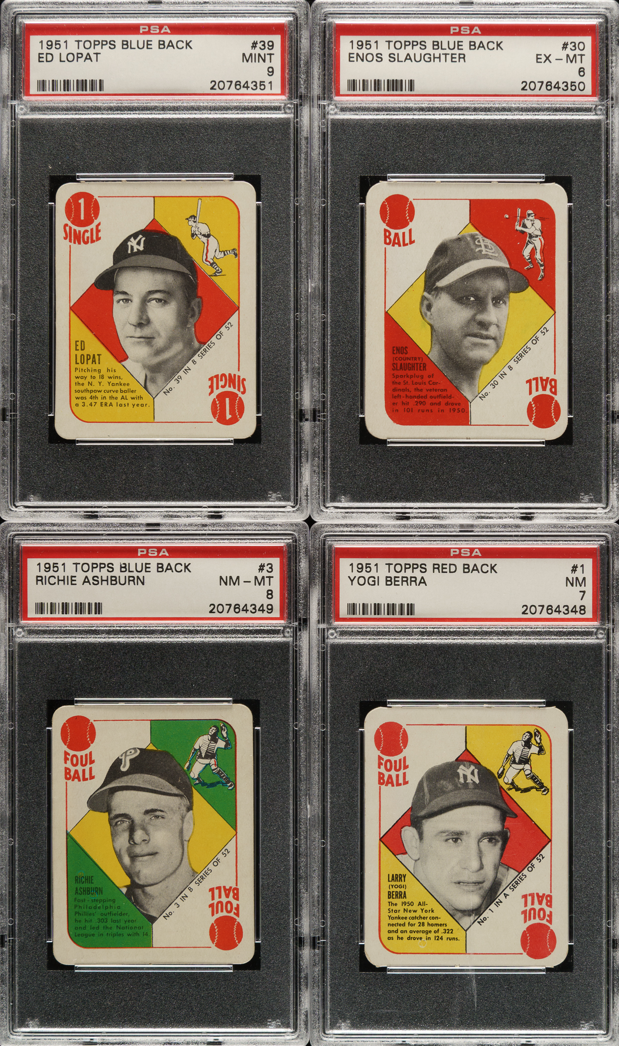 The 1951 Red and Blue Back sets are extremely significant as these were the first major baseball-card sets ever issued by Topps. Offered as a single lot are complete sets of both the 1951 Topps Red Backs and 1951 Topps Blue Backs, each with 52 cards plus one Red Back variation, for a total of 105 cards. Four cards have been professionally graded and encapsulated by PSA. This pair consists of the following: 1) 1951 Topps Red Back (52) Plus One Variation: Condition is 9% Nr/Mt, 9% Ex to Ex-Mt, 52% Vg to Vg-Ex, and 30% Gd (including 11% lesser). Keys: #1 Berra (NM 7), 5 Rizzuto (Vg), 6 Reynolds (Pr), 8 Wynn (Vg-Ex due to wrinkle on reverse), 15 Kiner (Pr, paper loss on reverse), 20 D. DiMaggio (Vg), 22 Feller (Gd), 30 Spahn (Gd+), 31 Hodges (Gd+), 36b Zernial/Philadelphia in bio (Gd+), 38 Snider (Gd), 39 Kluszewski (Vg+), 50 Irvin (Vg+), 52a Holmes/Boston (erasure marks, otherwise Gd+), and 52b Holmes/Hartford (Pr). 2) 1951 Topps Blue Back (52): Condition is 17% Nr/Mt to Nr/Mt-Mt (including one higher), 19% Ex to Ex-Mt, 45% Vg to Vg-Ex, and 19% Gd (including a couple lesser). Keys: #1 Yost (Vg), 3 Ashburn (NM-MT 8), 6 Schoendienst (Gd), 9 Sain (Vg-Ex due to wrinkle on reverse), 10 Page (Fr), 20 Branca (Gd-Vg), 30 Slaughter (EX-MT 6), 37 Doerr (Vg), 39 Lopat (MINT 9), 45 Pierce (Fr-Gd), 50 Mize (Vg+), and 52 Chapman (Gd+). The 1951 Red and Blue Back Topps sets are among the most significant yet overlooked of all early Topps cards, and in our opinion, they represent an extraordinary value. Total: 105 cards.