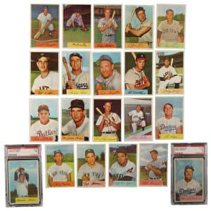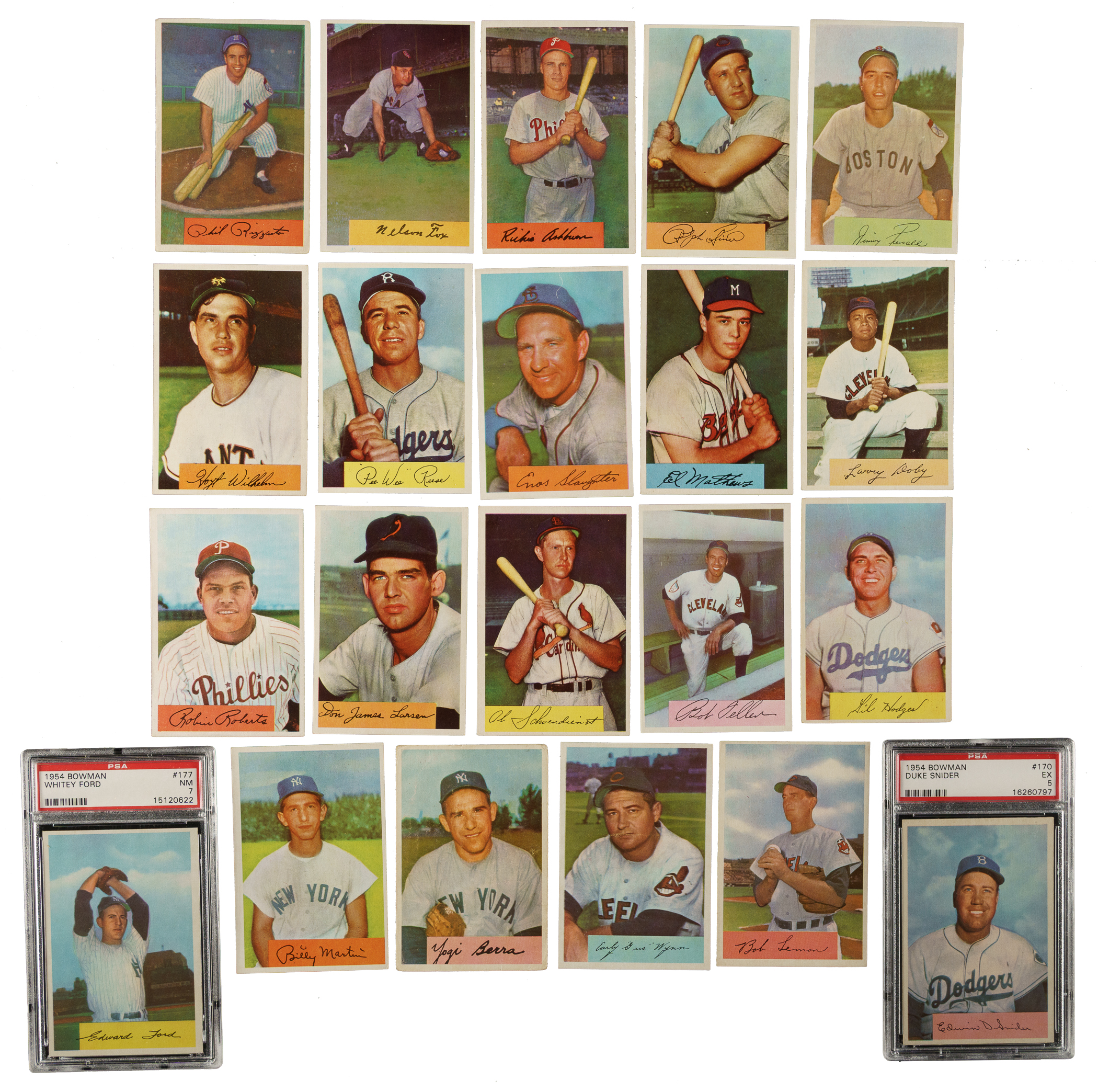 Presented is a 1954 Bowman near-complete master set consisting of the 225 cards (including #66 Ted Williams) in a complete set plus 35 variations (for a total of 260 cards). Missing only the following five variations for completion: #10a/two black loops in sky, 28a/birthplace N.J., 138a Hodges/.993/.991 Field Avg, 145b Martin/.983/.982 Field Avg, and 153a/100/331 assists. 1954 Bowman is one of the most overlooked (and compared to many other sets, most reasonably valued) classic bubble-gum card issues from the golden age of the 1950s. The #66 Ted Williams is the key card to the 1954 Bowman set and one of the legendary key cards among all postwar gum cards. The #66 Piersall is also included. Condition is 5% Ex-Mt to Nr/Mt, 64% Vg-Ex to Ex, and 31% Gd to Vg (including a couple lesser and a couple that measure small). Six cards have been professionally graded and encapsulated by PSA. Keys: #1 Rizzuto (Vg), 6 Fox (Vg+), 15 Ashburn (Vg+), 45 Kiner (Nr/Mt), 57 Wilhelm (Ex), 58 Reese (Nr/Mt), 62 Slaughter (Vg-Ex), 64 Mathews (Vg-Ex), 65 Mantle (VG-EX+ 4.5), 66 Williams (EX 5), 66 Piersall (Gd+), 84 Doby (Vg), 89 Mays (EX+ 5.5), 90 Campanella (EX 5), 95 Roberts (Vg-Ex), 101 Larsen RC (Vg-Ex+), 110 Schoendienst (Vg-Ex), 132 Feller (Nr/Mt), 138b Hodges/.992/.991 Field Avg (partially erased pencil on reverse, otherwise Vg), 145a Martin/.985/.983 Field Avg (Ex), 161 Berra (Fr-Gd), 164 Wynn (Nr/Mt), 170 Snider (EX 5), 177 Ford (NM 7), and 196 Lemon (Ex). This is a very attractive mid-grade near-complete master set of this classic and often overlooked Bowman issue. Total: 260 cards (complete set of 225 plus 35 variations).