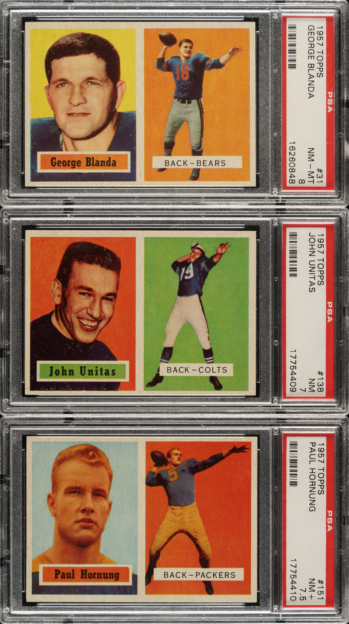 Presented is a very attractive complete 154-card set of 1957 Topps Football, highlighted by rookie cards of Bart Starr, Johnny Unitas, and Paul Hornung. Twelve cards have been professionally graded and encapsulated by PSA. Condition is 25% Nr/Mt to Nr/Mt-Mt (mostly Nr/Mt), 52% Ex to Ex-Mt, and 23% Vg to Vg-Ex (including a few lesser). Keys: #1 LeBaron (NM 7), 15 Butler RC (small pen mark on reverse, otherwise Ex), 22 Van Brocklin (NM 7), 30 Tittle (Vg-Ex+), 31 Blanda (NM-MT 8), 32 Layne (Ex), 65 Donovan (NM 7), 85 Lane RC (Vg-Ex+), 88 Gifford (Vg-Ex), 94 Berry RC (Vg-Ex), 104 Morrall RC (NM 7), 109 Conerly (EX-MT 6), 119 Starr RC (15/85 T/B, otherwise Vg), 124 McDonald RC (NM-MT 8), 128 Moore (NM 7), 130 (NM 7), 138 Unitas RC (NM 7), 147 Ford (EX 5), and 151 Hornung RC (NM+ 7.5). This is a very attractive, mid- to high-grade complete set of this popular football issue, highlighted by strong examples of the key rookie cards. The SMR value for just the twelve PSA-graded cards is $4,682. Total: 154 cards.