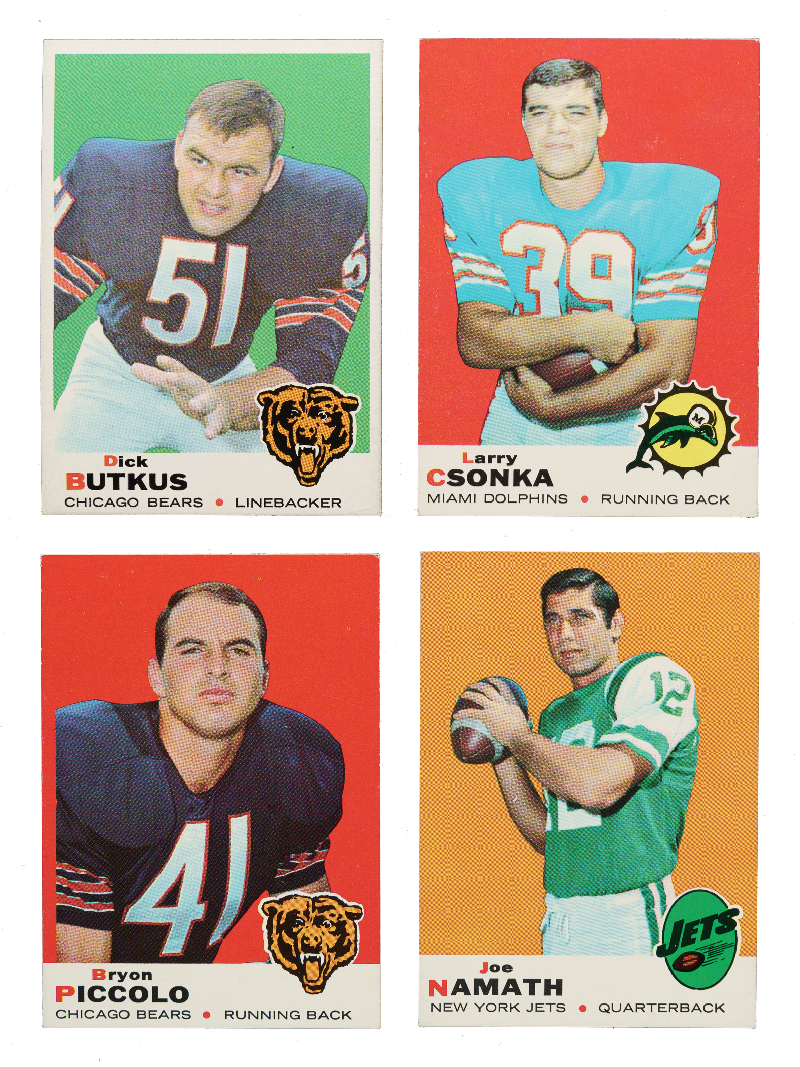 The colored flush-to-the-border design of the 1969 Topps Football low-number series makes this set particularly challenging to collect in extremely high grade. This classic set features all the stars of the era, including rookie cards of Hall of Famer Larry Csonka and Brian Piccolo, and stars such as Johnny Unitas, Joe Namath, Dick Butkus, Bart Starr, and Fran Tarkenton. Condition is 23% Ex-Mt to Nr/Mt and 77% Vg-Ex to Ex (including 3% slightly lesser). Keys: #25 Unitas (Ex), 26 Piccolo RC (Ex), 51 Sayers (slightly miscut left edge, otherwise Vg-Ex+), 100 Namath (Ex+), 120 Csonka RC (Vg-Ex), 139 Butkus (Ex), 150 Tarkenton (Ex), 161 Griese (Vg-Ex), and 215 Starr (Ex). This is a very attractive complete set of this classic 1960s Topps football issue. Total: 263 cards.