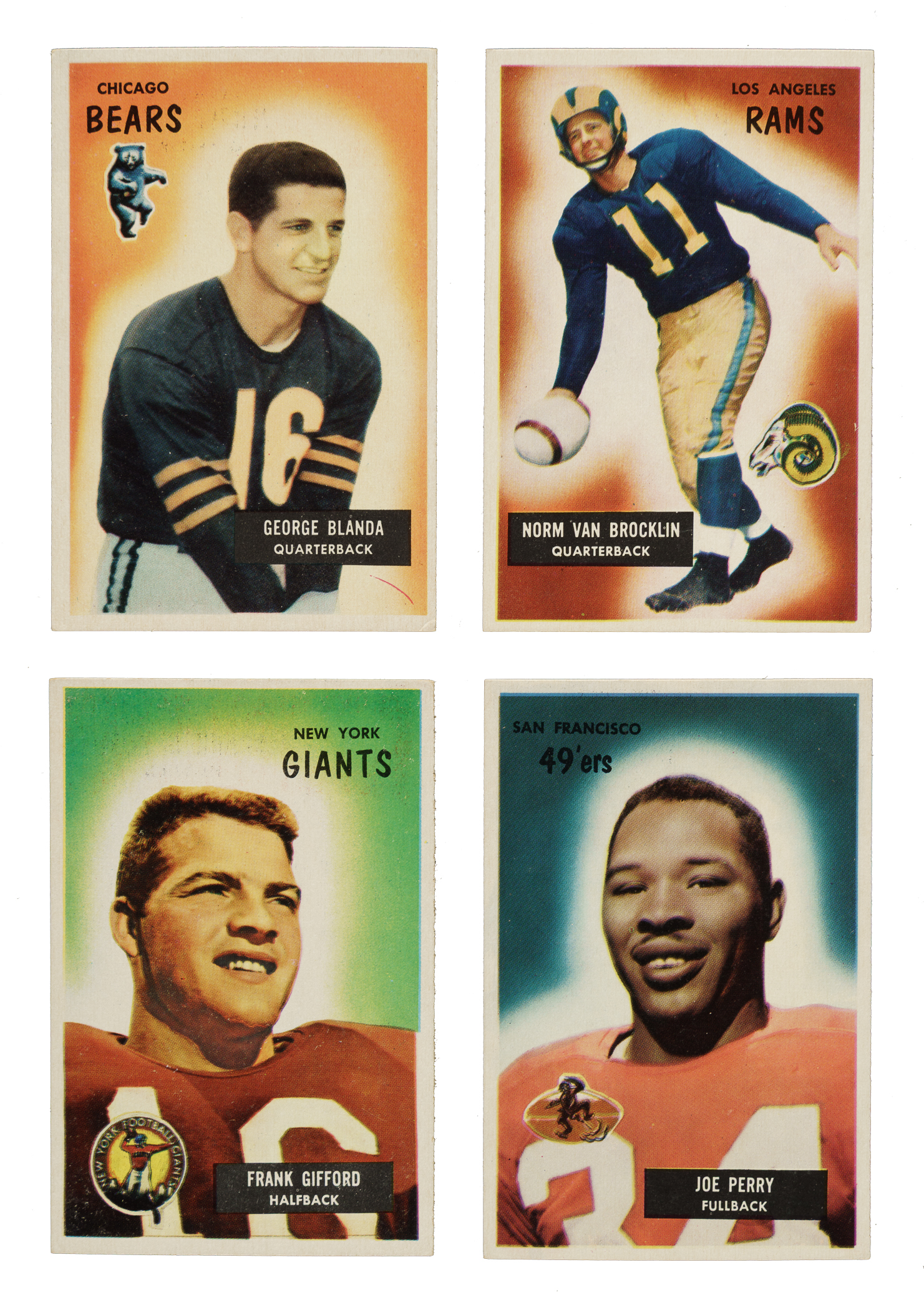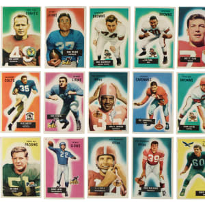 Complete 160-card set of 1955 Bowman Football, the last football-card set issued by Bowman Gum. Condition is 20% Ex-Mt to Nr/Mt, 65% Vg-Ex to Ex, and 15% Gd to Vg. Keys: #1 Walker (Ex), 2 McCormack RC (Ex), 7 Gifford (Vg-Ex), 8 Ameche RC (Ex), 14 Ford RC (Vg-Ex), 32 Van Brocklin (Ex+), 36 Stanfel RC (Ex), 42 Johnson RC (Ex), 44 Perry (Ex), 52 Summerall RC (Nr/Mt), 62 Blanda (Vg-Ex), 70 Ringo RC (Vg), 71 Layne (Vg+), 72 Tittle (5/95 T/B, otherwise Vg+), 75 McElhenny (Ex), 101 St. Clair RC (Vg+), 119 Gatski RC (Vg-Ex), 152 Landry (Ex), 158 Bednarik (Vg), and 160 Dupre (Ex). Very bright, clean, and attractive set of this classic 1950s Bowman football issue, which is loaded with stars and Hall of Famers. Total: 160 cards.