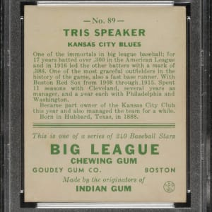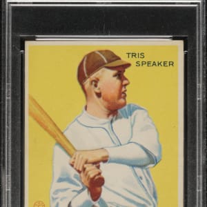 Graded NM-MT 8 by PSA. Exceptional high-grade example of legendary Hall of Famer Tris Speaker as a member of the Kansas City Blues. Out of 757 examples graded by PSA to date, only one has ever been graded higher by PSA. This card features a striking follow-through batting pose set against a deep yellow background. Outstanding registration, strong corners, and the reverse is crisp and clean, with bold green printing. A stunning high-grade example worthy of any ultra high-quality 1933 Goudey set or Hall of Fame collection.