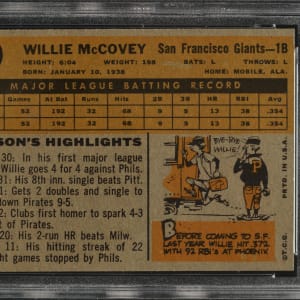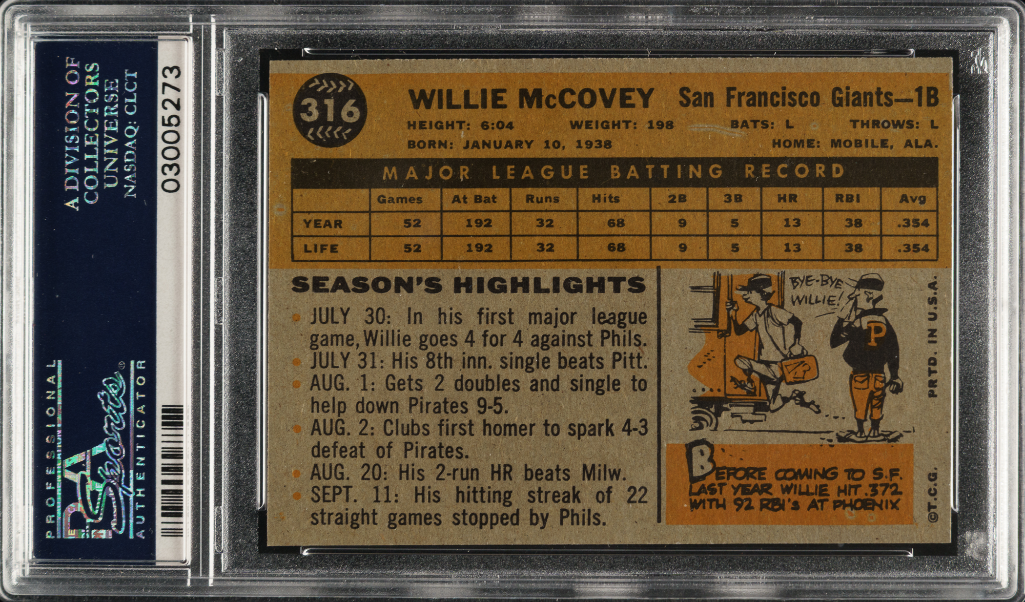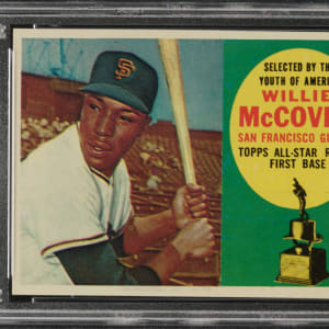 Graded MINT 9 by PSA. Superb example of Hall of Famer Willie McCovey's rookie card from the classic 1960 Topps set. Of the more than 6,962 examples of this card PSA has evaluated to date, none have been graded higher. Bright and crisp with bold colors and four sharp corners. Clean reverse. A worthy addition to any world-class complete 1960 Topps set, San Francisco Giants, or Hall of Fame rookie collection.