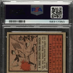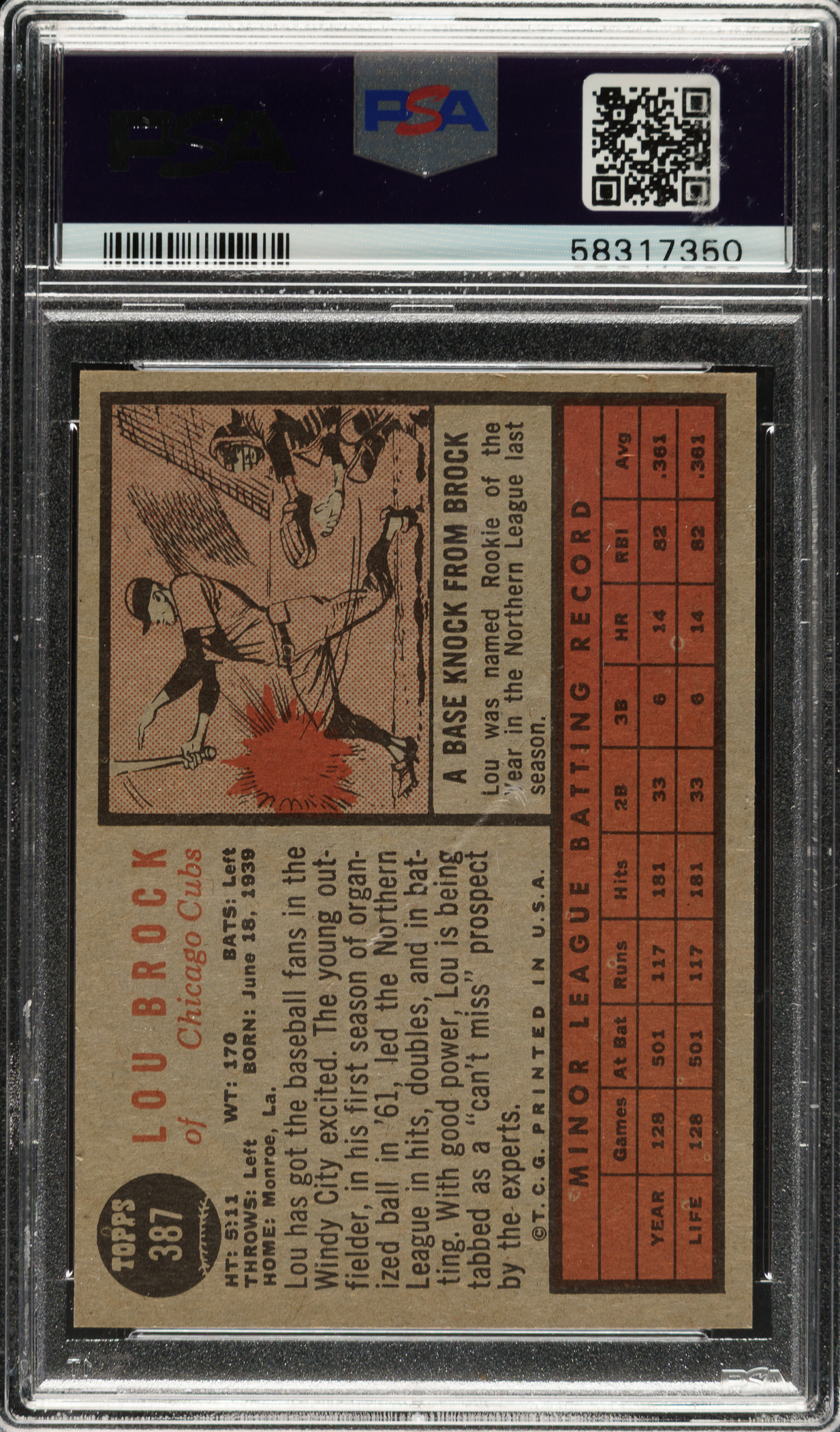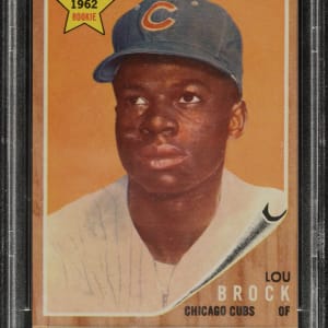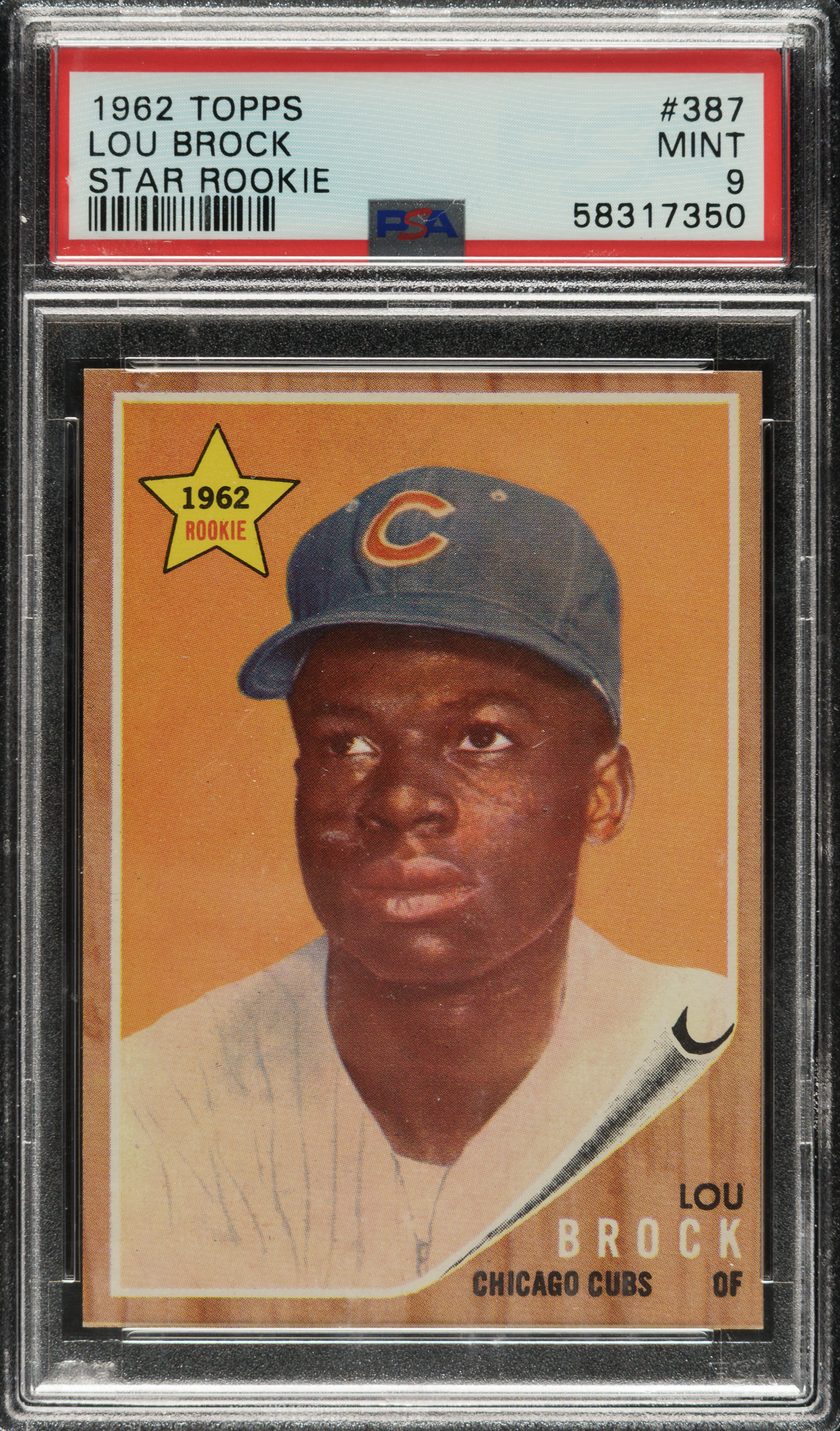 Graded MINT 9 by PSA. Exceptional ultra-high-grade rookie card of Hall of Famer Lou Brock from the 1962 Topps set. This is a superb example with a crisp image, brilliant colors, and four sharp corners. Clean reverse. This is a tremendous card of the key rookie from this popular 1960s Topps set, which would make a wonderful addition to any complete set, Hall of Fame rookie card, or Lou Brock collection.
