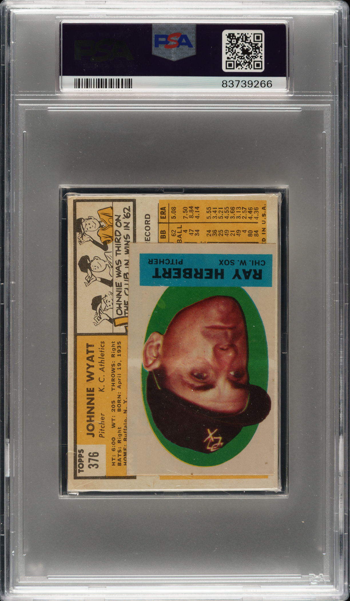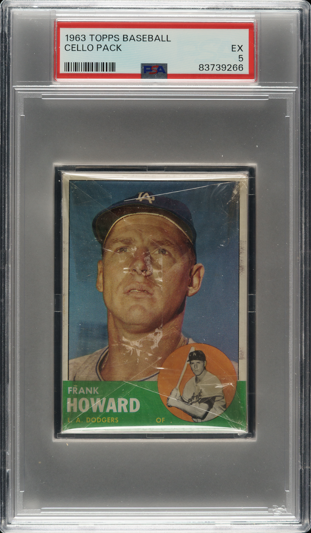 Graded EX 5 by PSA. Original cello pack from the 1963 Topps baseball set featuring #123 Frank Howard on top and #376 Johnnie Wyatt on the bottom. The pack is tightly sealed with no staining. A worthy addition to any unopened pack collection or companion to any complete 1963 Topps set.