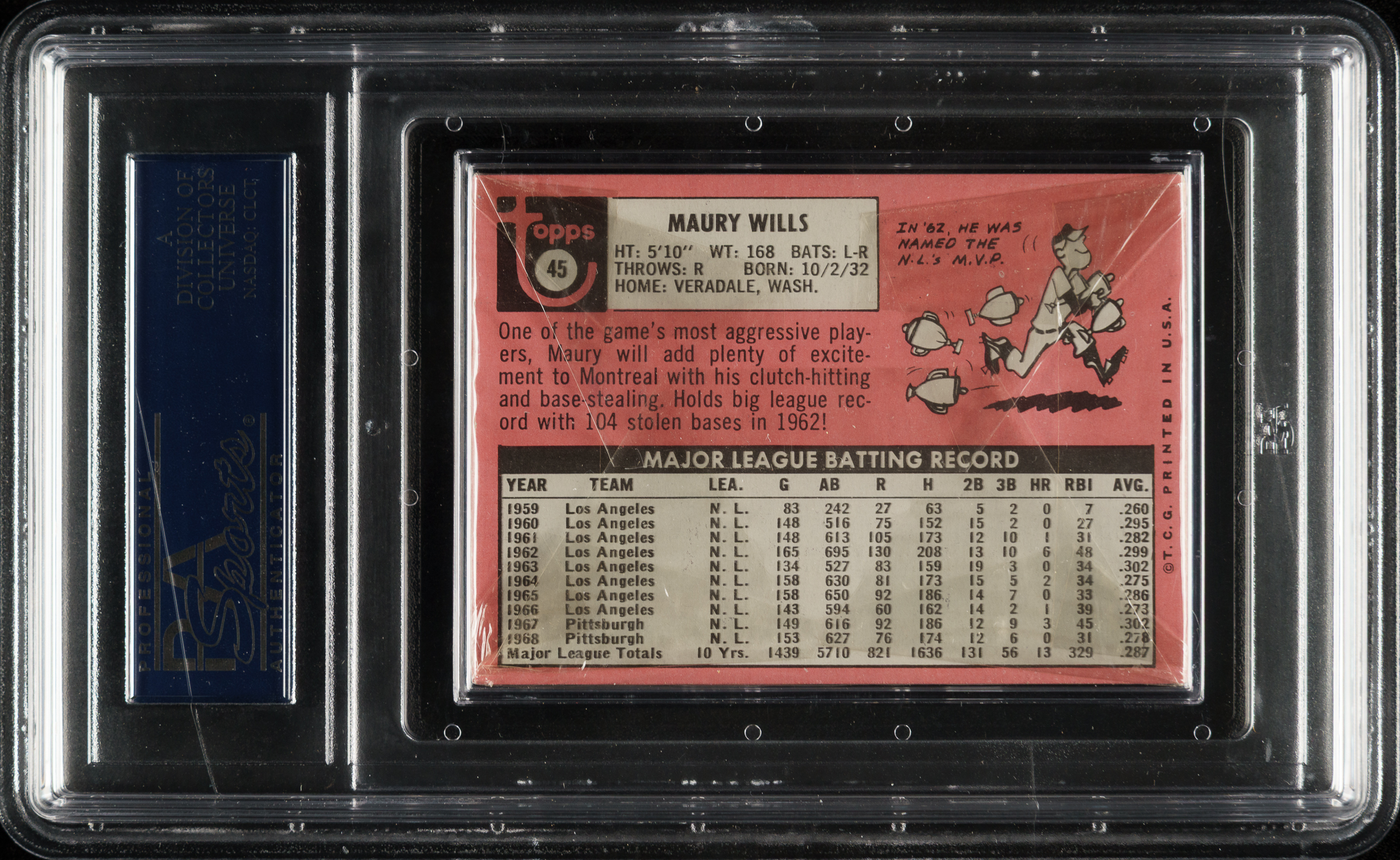 Graded MINT 9 by PSA. Superb high-grade original unopened cello pack from the first series of 1969 Topps baseball with #7 "AL ERA Leaders" (Tiant/McDowell/McNally) on front and #45 Maury Wills on the reverse. It has a tight seal with no staining. This series includes Hall of Famers Hank Aaron, Ernie Banks, Johnny Bench, and Roberto Clemente. An outstanding and rarely seen unopened cello pack.