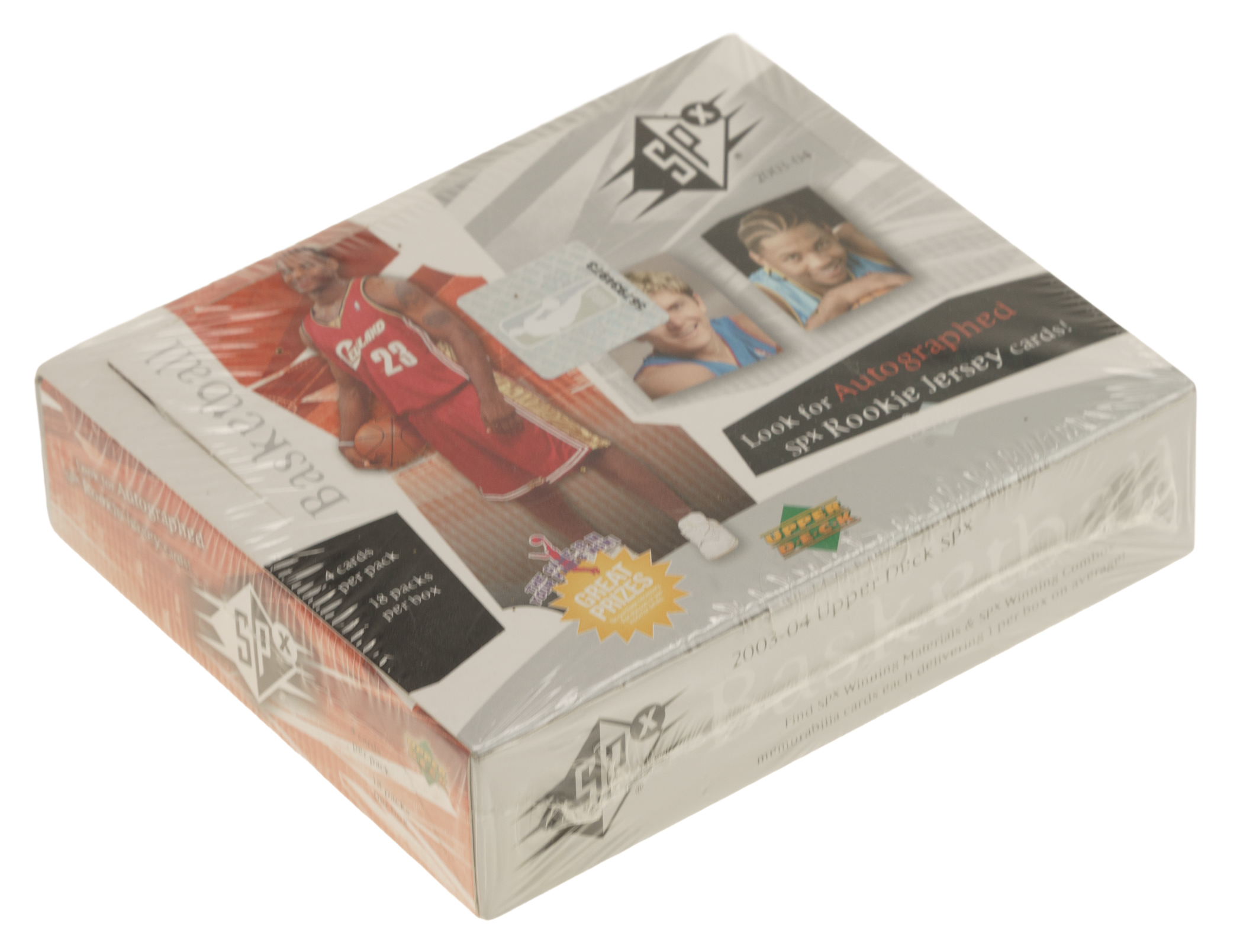 Presented is an unopened 2003-2004 Upper Deck SPx Basketball hobby box containing 18 packs. The box is wrapped in its original factory cellophane. The key to this set is the rookie card of LeBron James, as well as the rookie cards of Carmelo Anthony, Chris Bosh, and Dwyane Wade. Also included within the set are a wide array of parallel and insert cards, including Spectrum, Winning Materials, and Winning Combos. An extremely desirable unopened hobby box from this popular modern basketball issue.
