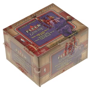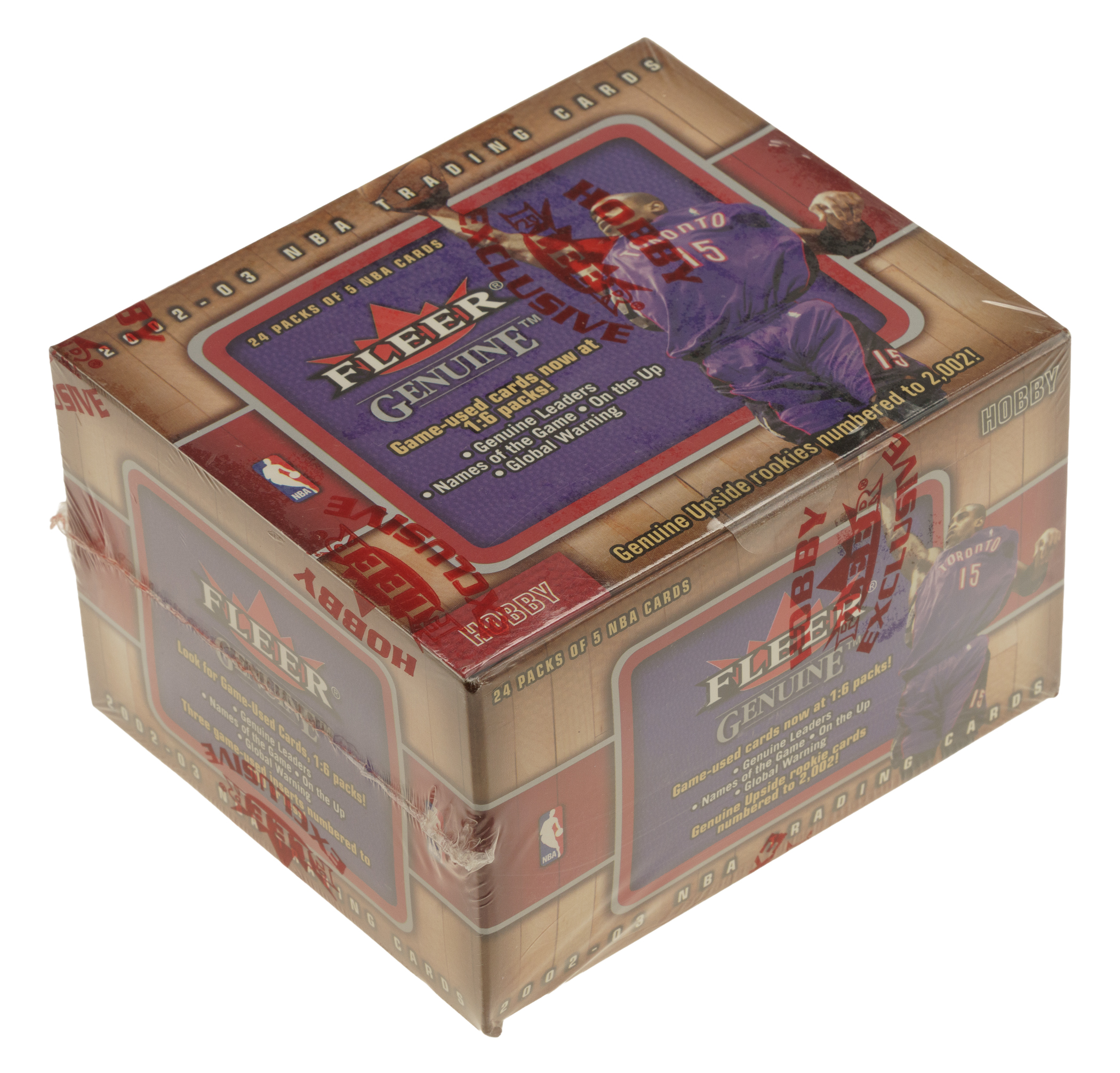 Presented is an unopened hobby box of 2002-2003 Fleer Genuine Basketball containing 24 packs. The box is wrapped in its original factory cellophane. The series is highlighted by the rookie cards of Yao Ming and Amar'e Stoudemire, along with several desirable insert cards. An outstanding unopened hobby box from this popular modern basketball issue.
