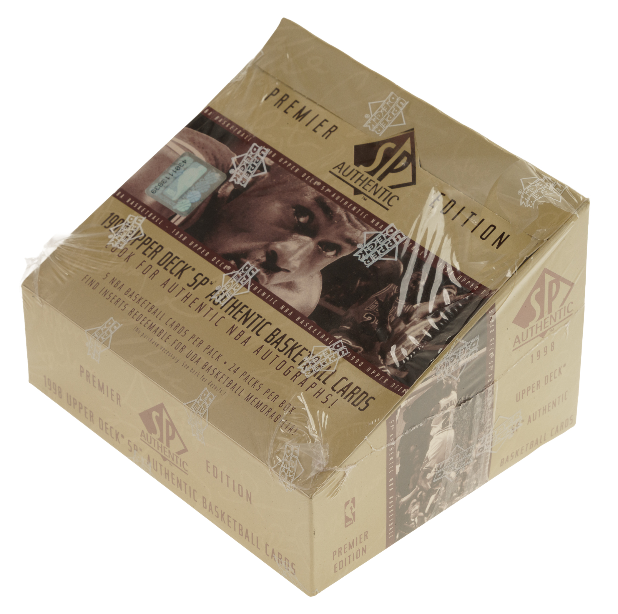 Presented is an unopened 1997-1998 SP Authentic basketball hobby box containing 36 packs. The box is wrapped in its original factory cellophane. The series is highlighted by the rookie cards of Tim Duncan and Tracy McGrady, along with several desirable insert cards. An outstanding unopened hobby box from this popular modern basketball issue. The size/weight of this item requires that there will be an additional shipping charge for this lot.