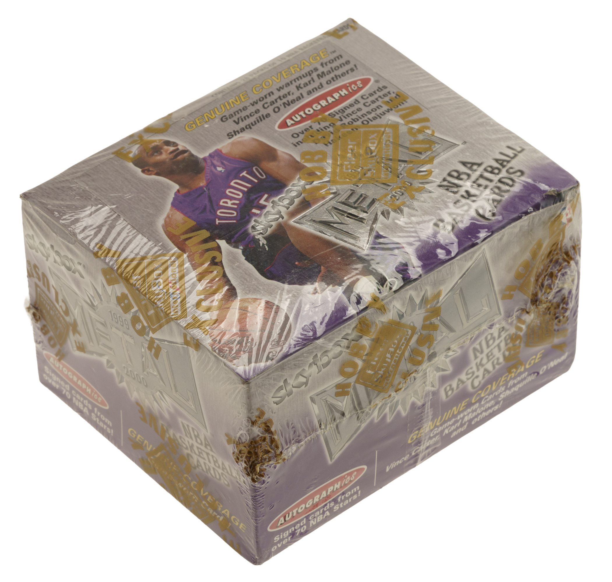 Presented is an unopened 1999-2000 Fleer SkyBox Metal basketball hobby box containing 28 packs. The box is wrapped in its original factory cellophane. The set is highlighted by rookie cards of Steve Francis and Elton Brand, along with several desirable insert and parallel cards. An outstanding unopened hobby box from this classic modern basketball issue.