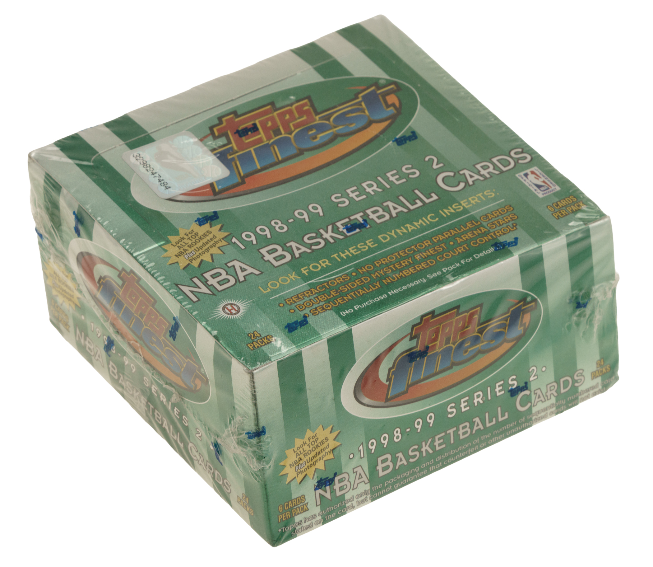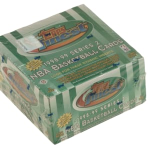 Presented is an unopened 1998-1999 Topps Finest Basketball Second Series hobby box containing twenty-four packs. The box is wrapped in its original factory cellophane. The series is highlighted by the rookie cards of Dirk Nowitzki, Vince Carter, and Paul Pierce, along with several desirable insert cards. An outstanding unopened hobby box from this popular modern basketball issue.