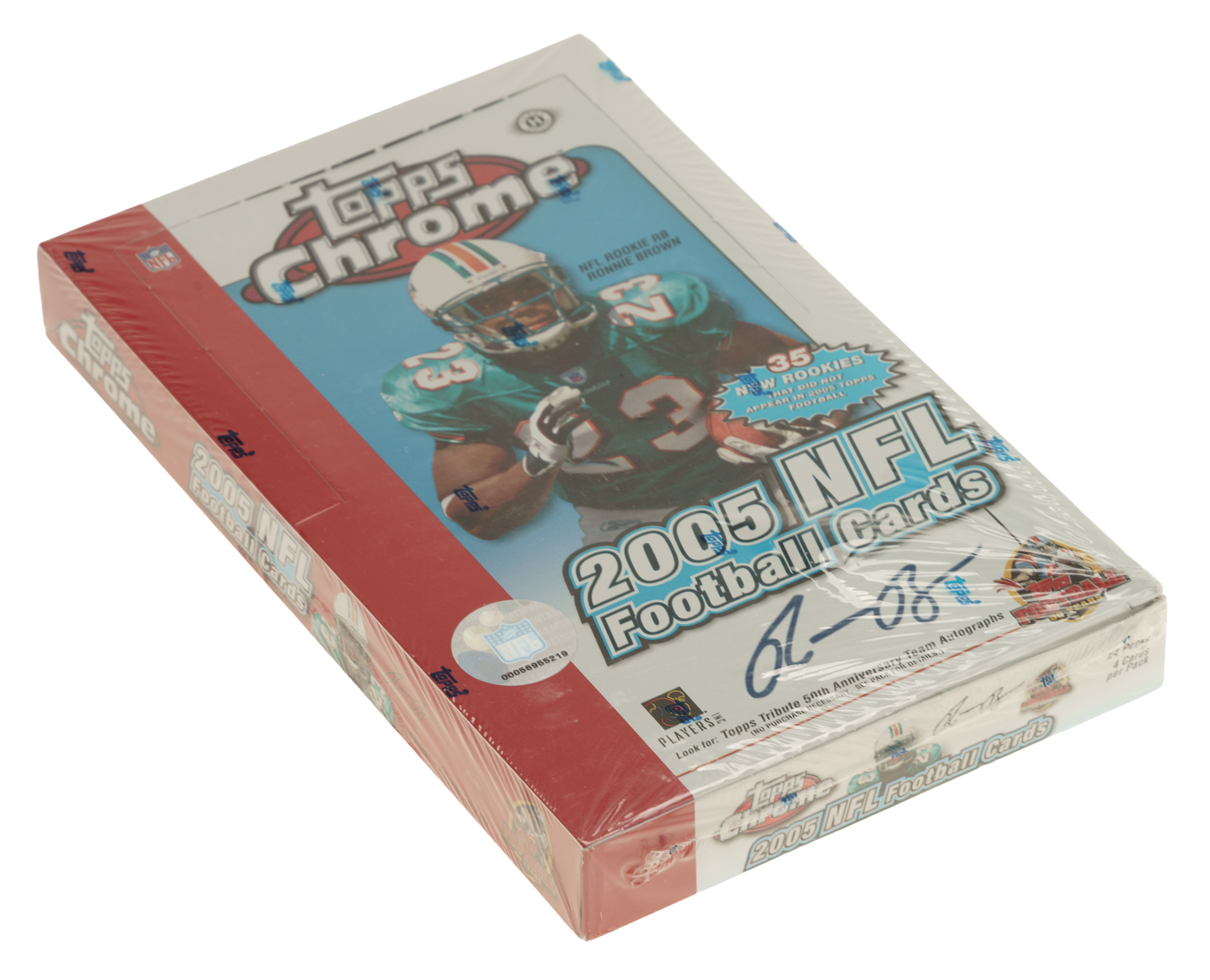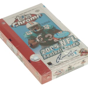 Presented is an unopened 2005 Topps Chrome football hobby box containing 24 packs. The box is wrapped in its original factory cellophane. Notable players with rookie cards in the set include Aaron Rodgers, Frank Gore, and DeMarcus Ware.